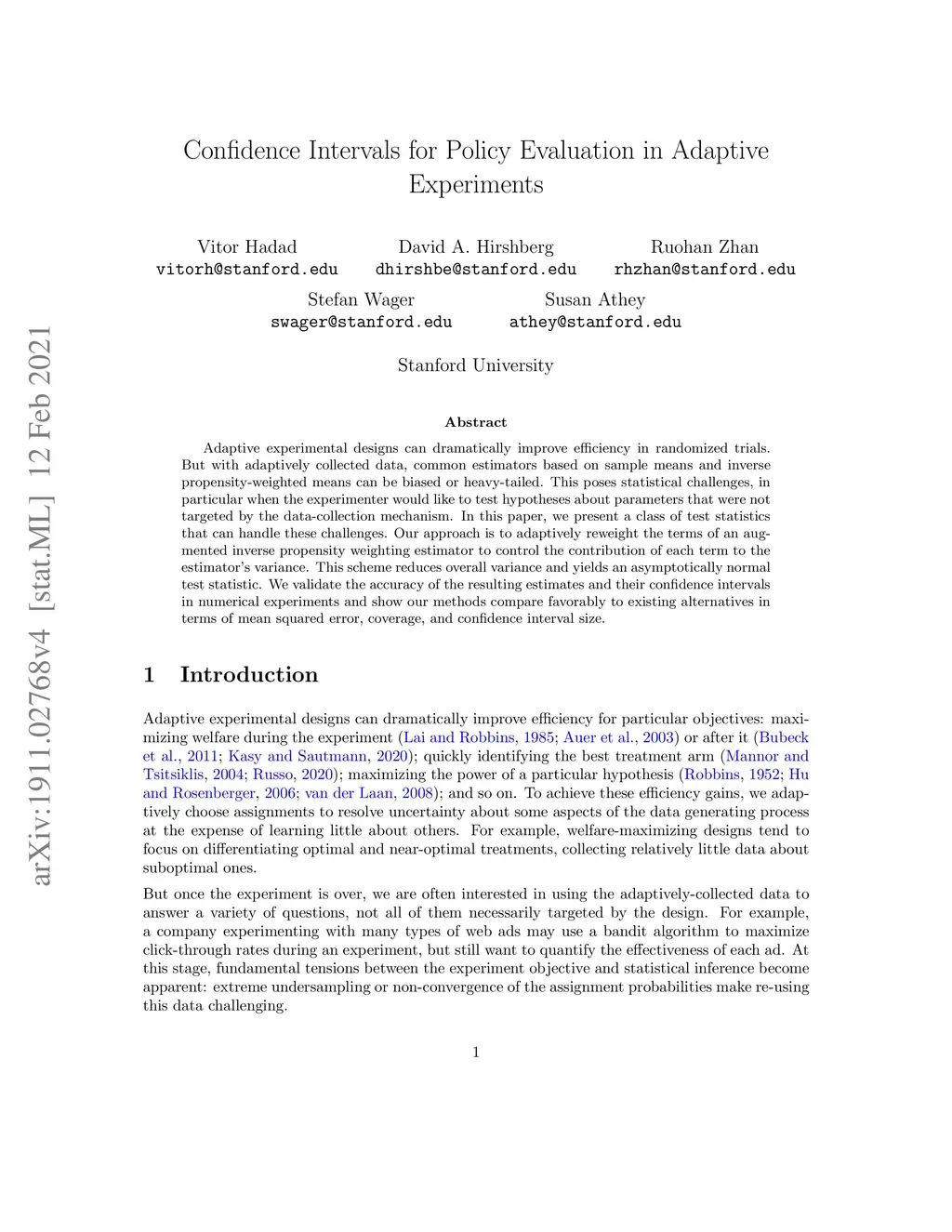 Adaptive experiments can result in considerable cost savings in multi-armed trials by enabling analysts to quickly focus on the most promising alternatives. Most existing work on adaptive experiments (which include multi-armed bandits) has focused maximizing the speed at which the analyst can identify the optimal arm and/or minimizing the number of draws from sub-optimal arms. In many scientific settings, however, it is not only of interest to identify the optimal arm, but also to perform a statistical analysis of the data collected from the experiment. Naive approaches to statistical inference with adaptive inference fail because many commonly used statistics (such as sample means or inverse propensity weighting) do not have an asymptotically Gaussian limiting distribution centered on the estimate, and so confidence intervals constructed from these statistics do not have correct coverage. But, as shown in this paper, carefully designed data-adaptive weighting schemes can be used to overcome this issue and restore a relevant central limit theorem, enabling hypothesis testing. We validate the accuracy of the resulting confidence intervals in numerical experiments.