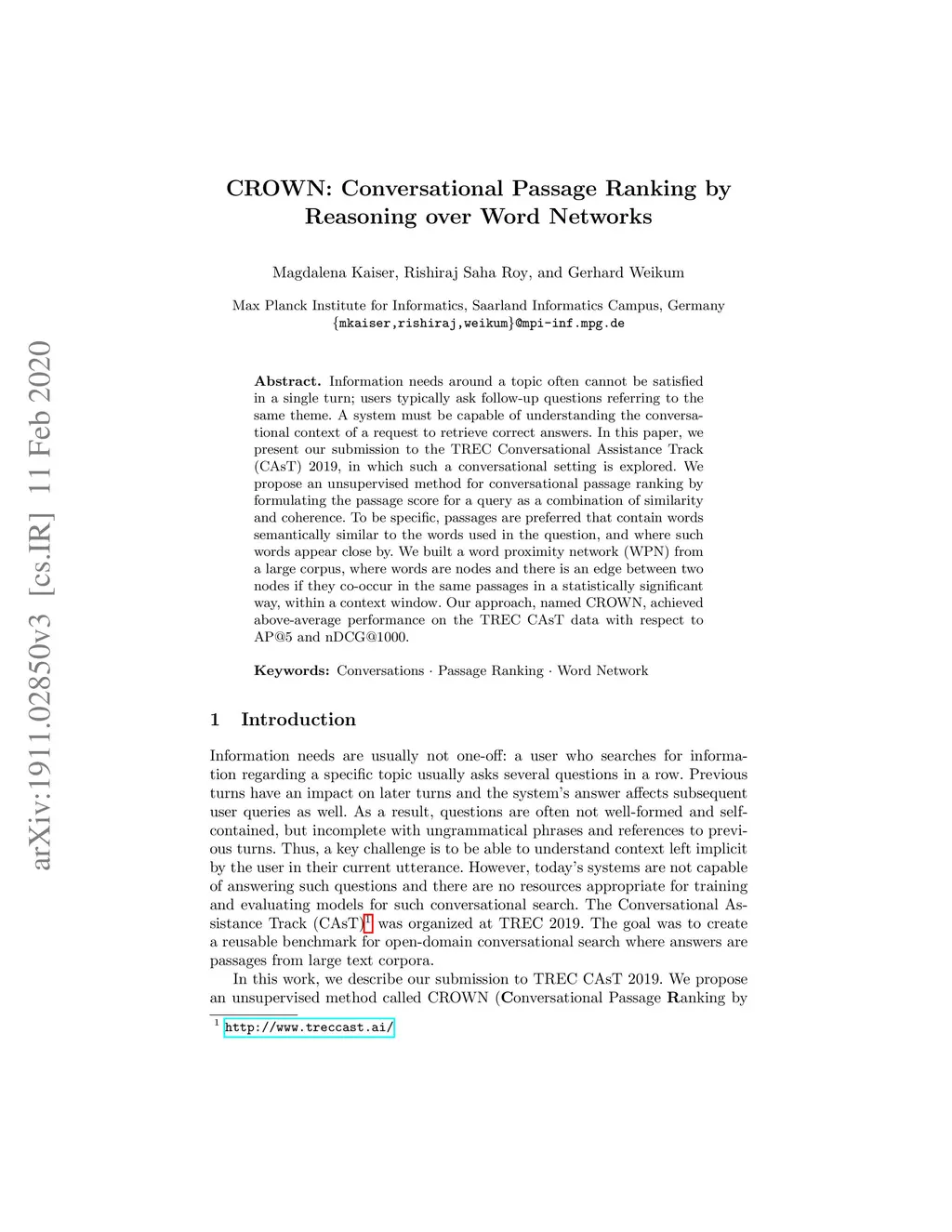 Information needs around a topic cannot be satisfied in a single turn; users typically ask follow-up questions referring to the same theme and a system must be capable of understanding the conversational context of a request to retrieve correct answers. In this paper, we present our submission to the TREC Conversational Assistance Track 2019, in which such a conversational setting is explored. We propose a simple unsupervised method for conversational passage ranking by formulating the passage score for a query as a combination of similarity and coherence. To be specific, passages are preferred that contain words semantically similar to the words used in the question, and where such words appear close by. We built a word-proximity network (WPN) from a large corpus, where words are nodes and there is an edge between two nodes if they co-occur in the same passages in a statistically significant way, within a context window. Our approach, named CROWN, improved nDCG scores over a provided Indri baseline on the CAsT training data. On the evaluation data for CAsT, our best run submission achieved above-average performance with respect to AP@5 and nDCG@1000.
