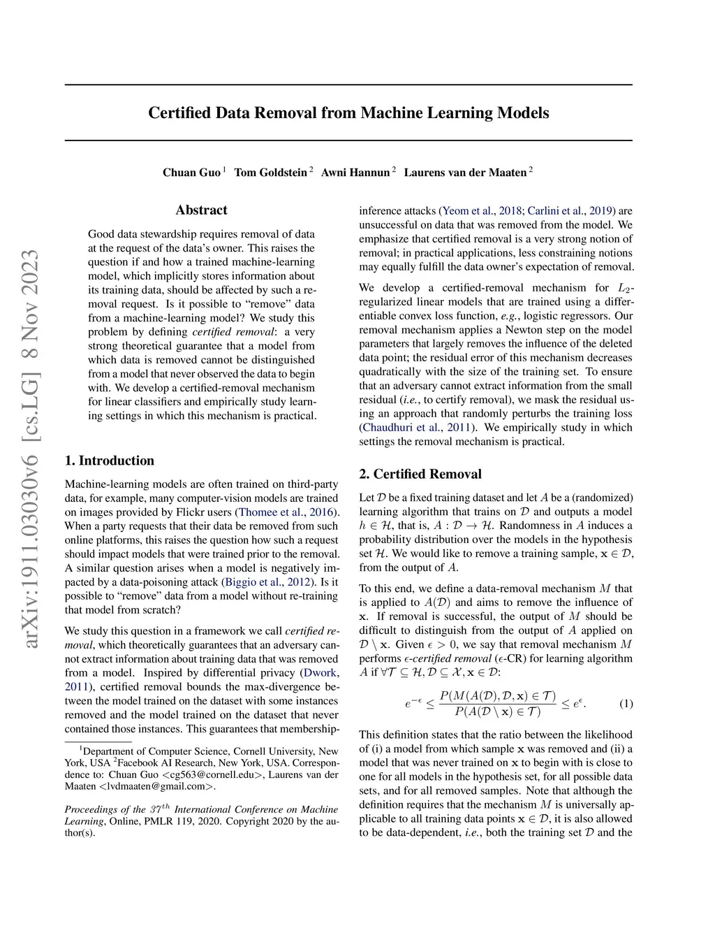 Good data stewardship requires removal of data at the request of the data's owner. This raises the question if and how a trained machine-learning model, which implicitly stores information about its training data, should be affected by such a removal request. Is it possible to "remove" data from a machine-learning model? We study this problem by defining certified removal: a very strong theoretical guarantee that a model from which data is removed cannot be distinguished from a model that never observed the data to begin with. We develop a certified-removal mechanism for linear classifiers and empirically study learning settings in which this mechanism is practical.
