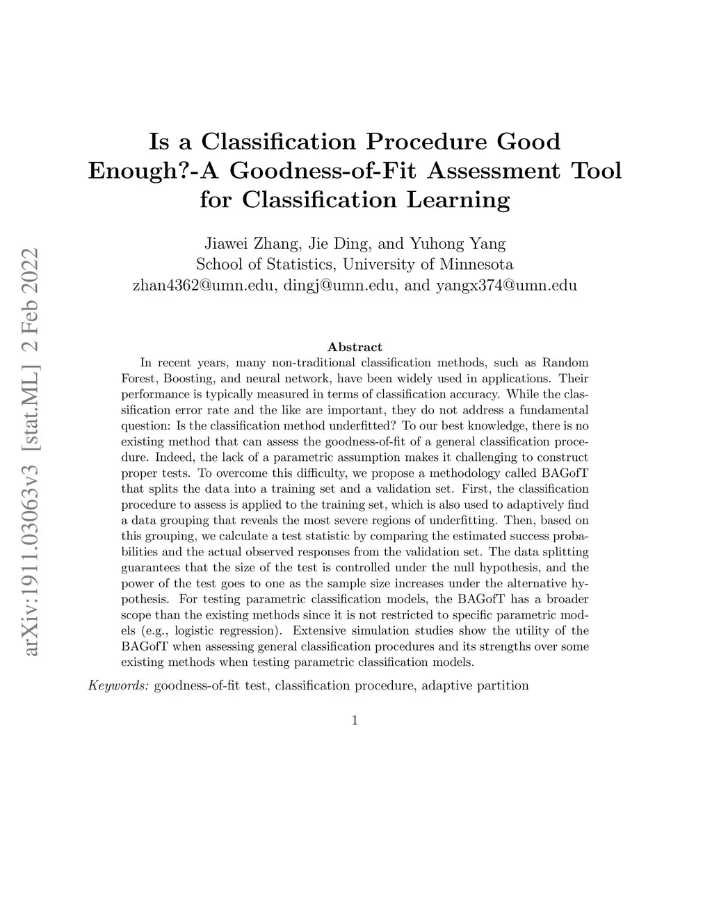 In recent years, many non-traditional classification methods, such as Random Forest, Boosting, and neural network, have been widely used in applications. Their performance is typically measured in terms of classification accuracy. While the classification error rate and the like are important, they do not address a fundamental question: Is the classification method underfitted? To our best knowledge, there is no existing method that can assess the goodness-of-fit of a general classification procedure. Indeed, the lack of a parametric assumption makes it challenging to construct proper tests. To overcome this difficulty, we propose a methodology called BAGofT that splits the data into a training set and a validation set. First, the classification procedure to assess is applied to the training set, which is also used to adaptively find a data grouping that reveals the most severe regions of underfitting. Then, based on this grouping, we calculate a test statistic by comparing the estimated success probabilities and the actual observed responses from the validation set. The data splitting guarantees that the size of the test is controlled under the null hypothesis, and the power of the test goes to one as the sample size increases under the alternative hypothesis. For testing parametric classification models, the BAGofT has a broader scope than the existing methods since it is not restricted to specific parametric models (e.g., logistic regression). Extensive simulation studies show the utility of the BAGofT when assessing general classification procedures and its strengths over some existing methods when testing parametric classification models.
