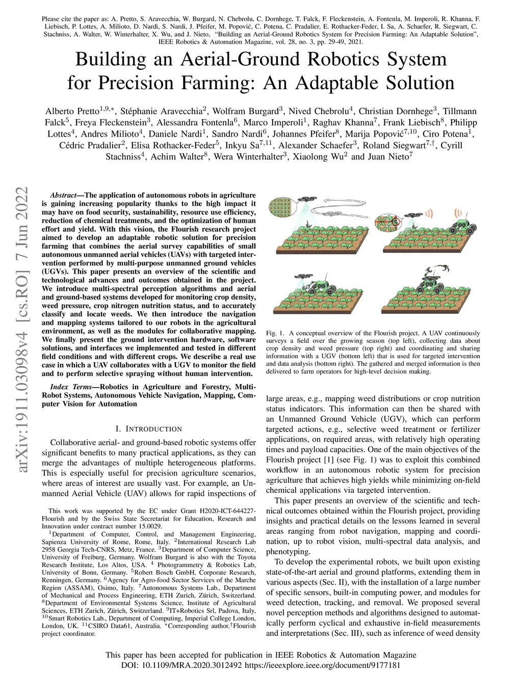 The application of autonomous robots in agriculture is gaining increasing popularity thanks to the high impact it may have on food security, sustainability, resource use efficiency, reduction of chemical treatments, and the optimization of human effort and yield. With this vision, the Flourish research project aimed to develop an adaptable robotic solution for precision farming that combines the aerial survey capabilities of small autonomous unmanned aerial vehicles (UAVs) with targeted intervention performed by multi-purpose unmanned ground vehicles (UGVs). This paper presents an overview of the scientific and technological advances and outcomes obtained in the project. We introduce multi-spectral perception algorithms and aerial and ground-based systems developed for monitoring crop density, weed pressure, crop nitrogen nutrition status, and to accurately classify and locate weeds. We then introduce the navigation and mapping systems tailored to our robots in the agricultural environment, as well as the modules for collaborative mapping. We finally present the ground intervention hardware, software solutions, and interfaces we implemented and tested in different field conditions and with different crops. We describe a real use case in which a UAV collaborates with a UGV to monitor the field and to perform selective spraying without human intervention.