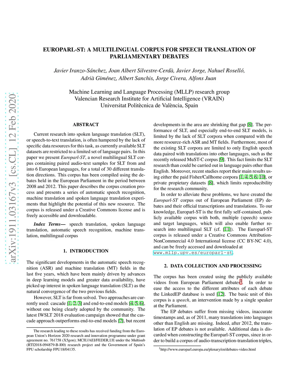 Europarl-ST: A Multilingual Corpus For Speech Translation Of