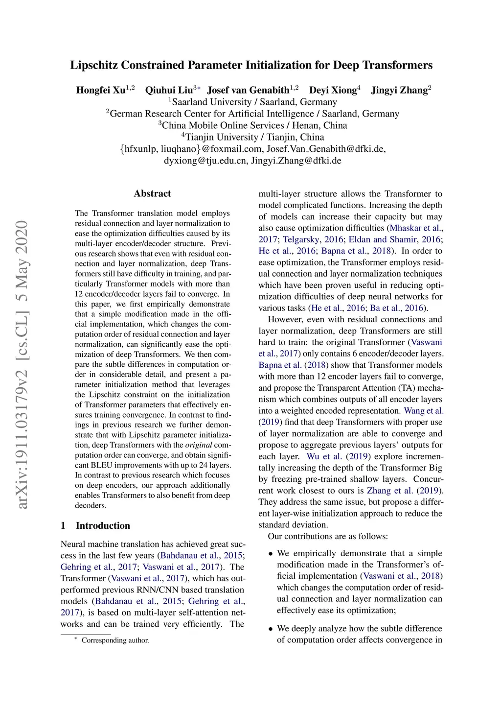 The Transformer translation model employs residual connection and layer normalization to ease the optimization difficulties caused by its multi-layer encoder/decoder structure. While several previous works show that even with residual connection and layer normalization, deep Transformers still have difficulty in training, and particularly a Transformer model with more than 12 encoder/decoder layers fails to converge. In this paper, we first empirically demonstrate that a simple modification made in the official implementation which changes the computation order of residual connection and layer normalization can effectively ease the optimization of deep Transformers. In addition, we deeply compare the subtle difference in computation order, and propose a parameter initialization method which simply puts Lipschitz restriction on the initialization of Transformers but can effectively ensure their convergence. We empirically show that with proper parameter initialization, deep Transformers with the original computation order can converge, which is quite in contrast to all previous works, and obtain significant improvements with up to 24 layers. Our proposed approach additionally enables to benefit from deep decoders compared to previous works which focus on deep encoders.