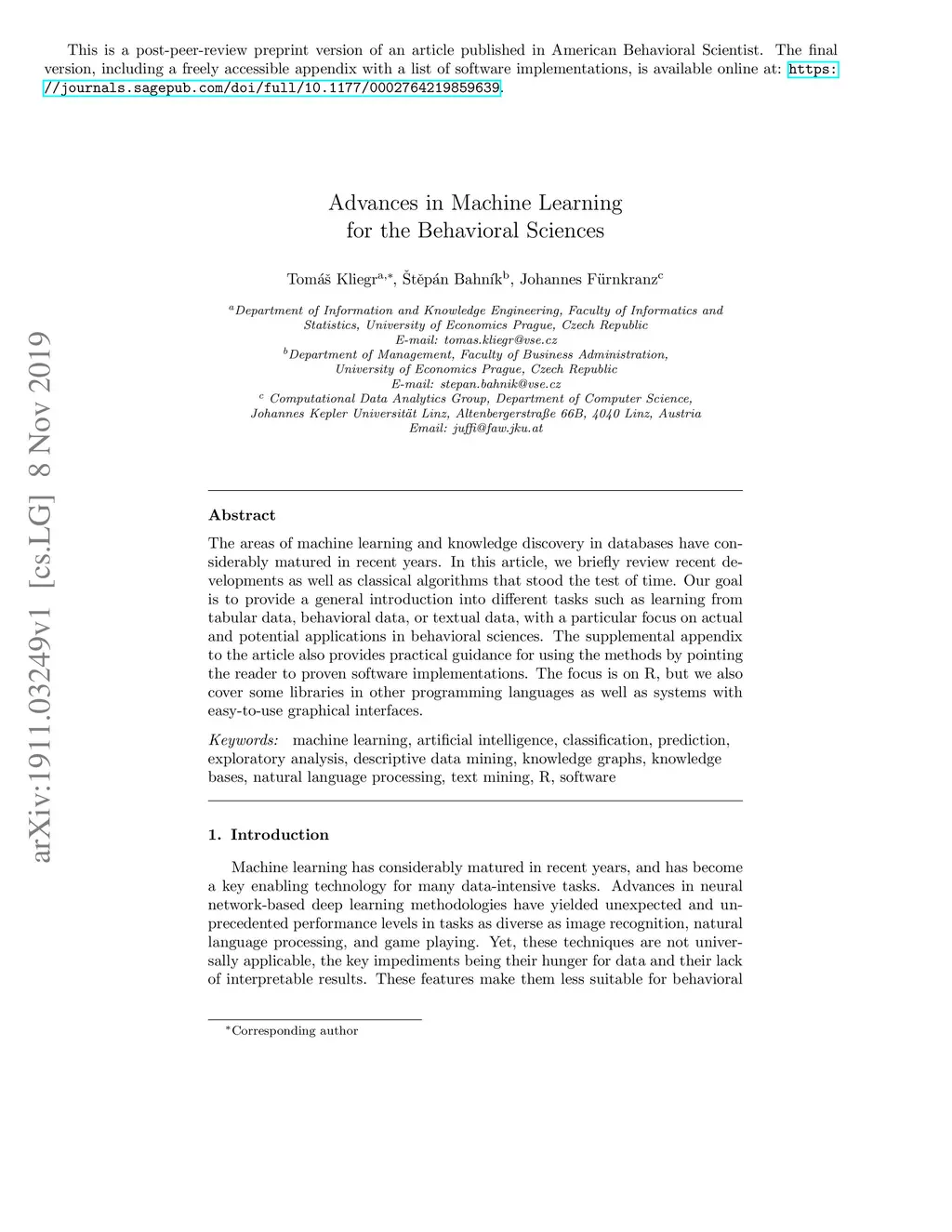 The areas of machine learning and knowledge discovery in databases have considerably matured in recent years. In this article, we briefly review recent developments as well as classical algorithms that stood the test of time. Our goal is to provide a general introduction into different tasks such as learning from tabular data, behavioral data, or textual data, with a particular focus on actual and potential applications in behavioral sciences. The supplemental appendix to the article also provides practical guidance for using the methods by pointing the reader to proven software implementations. The focus is on R, but we also cover some libraries in other programming languages as well as systems with easy-to-use graphical interfaces.