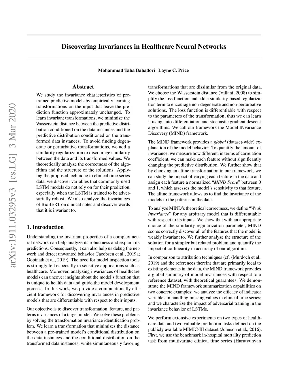 We study the invariance characteristics of pre-trained predictive models by empirically learning transformations on the input that leave the prediction function approximately unchanged. To learn invariant transformations, we minimize the Wasserstein distance between the predictive distribution conditioned on the data instances and the predictive distribution conditioned on the transformed data instances. To avoid finding degenerate or perturbative transformations, we add a similarity regularization to discourage similarity between the data and its transformed values. We theoretically analyze the correctness of the algorithm and the structure of the solutions. Applying the proposed technique to clinical time series data, we discover variables that commonly-used LSTM models do not rely on for their prediction, especially when the LSTM is trained to be adversarially robust. We also analyze the invariances of BioBERT on clinical notes and discover words that it is invariant to.