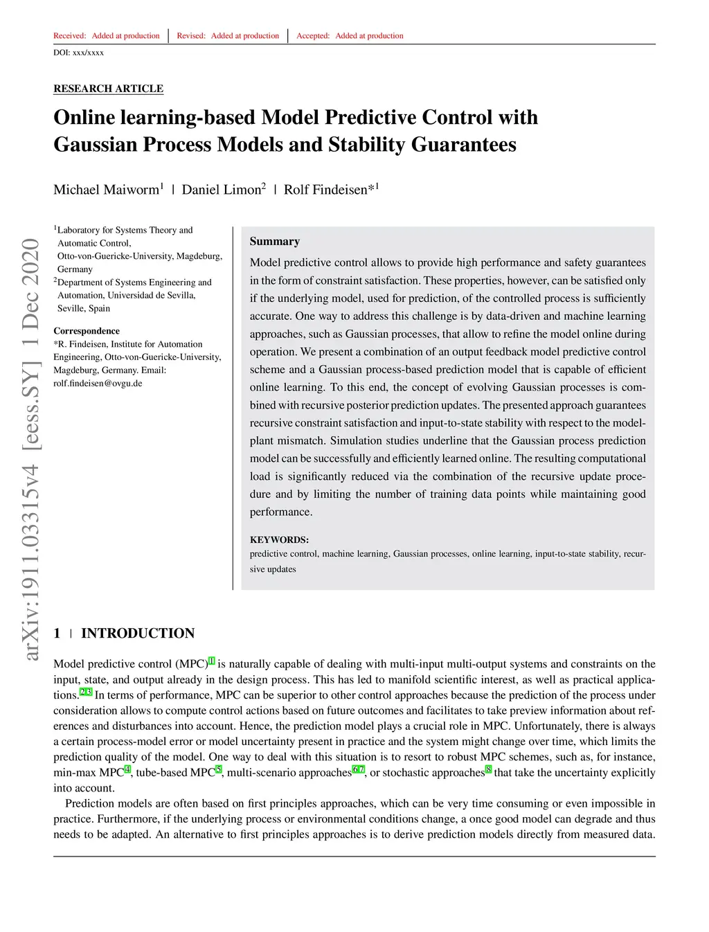 Model predictive control allows to provide high performance and safety guarantees in the form of constraint satisfaction. These properties however can be satisfied only if the underlying model used for prediction of the controlled process is sufficiently accurate. One way to address this challenge is by data-driven and machine learning approaches, such as Gaussian processes, that allow to refine the model online during operation. We present a combination of an output feedback model predictive control scheme and a Gaussian process based prediction model that is capable of efficient online learning. To this end the concept of evolving Gaussian processes is combined with recursive posterior prediction updates. The presented approach guarantees recursive constraint satisfaction and input-to-state stability with respect to the model-plant mismatch. Simulation studies underline that the Gaussian process prediction model can be successfully and efficiently learned online. The resulting computational load is significantly reduced via the combination of the recursive update procedure and by limiting the number of training data points, while maintaining good performance.