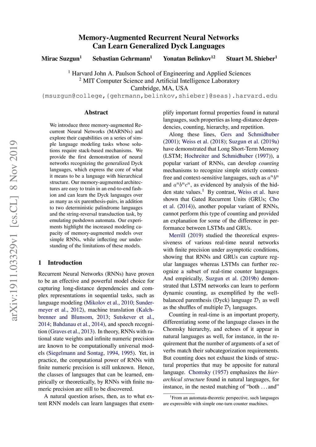 Memory-Augmented Recurrent Neural Networks Can Learn Generalized Dyck