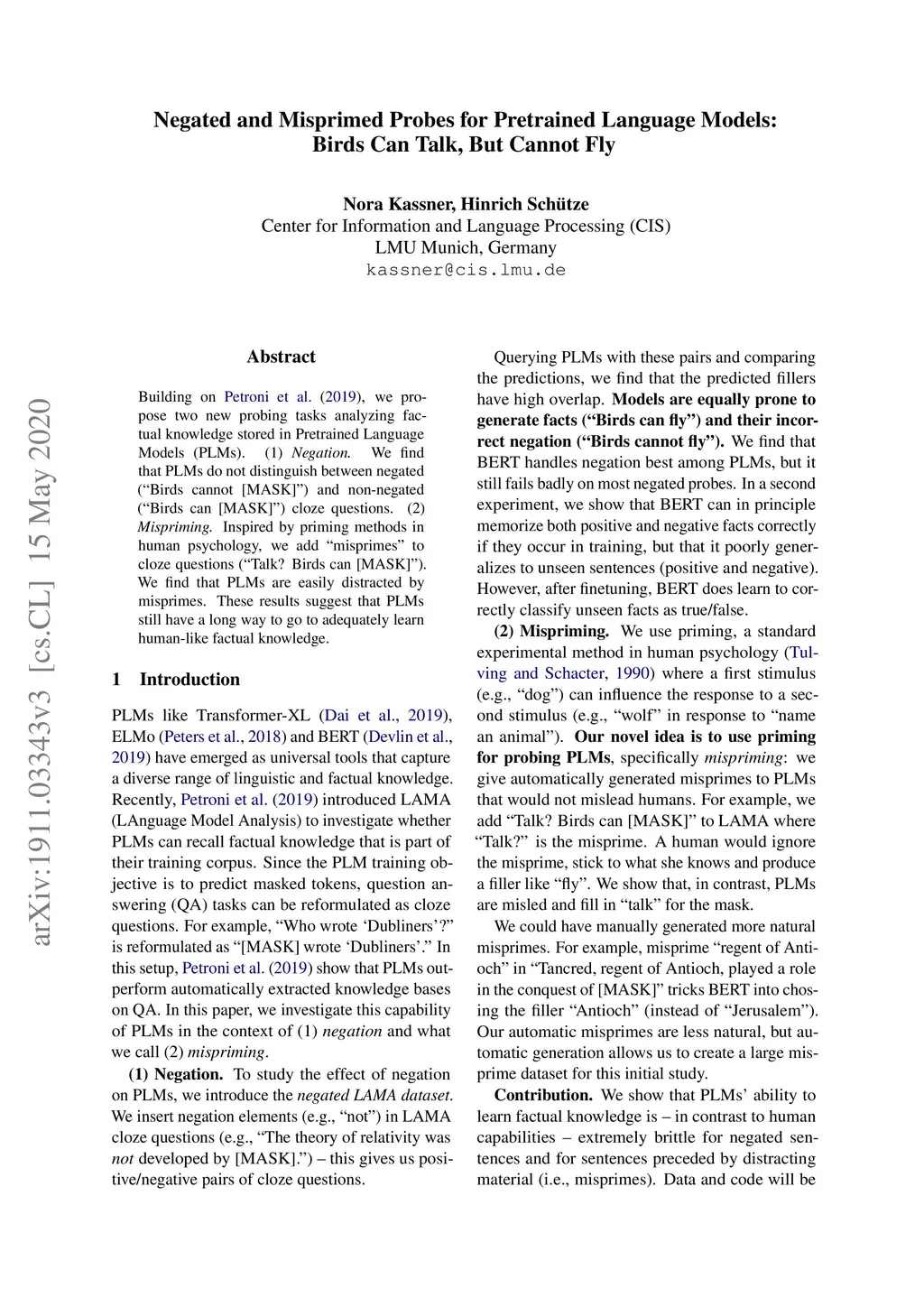 Negated and Misprimed Probes for Pretrained Language Models: Birds Can