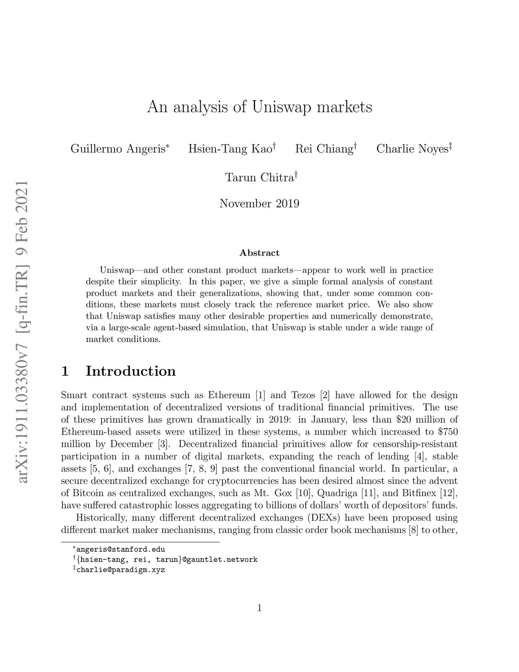 Uniswap -- and other constant product markets -- appear to work well in practice despite their simplicity. In this paper, we give a simple formal analysis of constant product markets and their generalizations, showing that, under some common conditions, these markets must closely track the reference market price. We also show that Uniswap satisfies many other desirable properties and numerically demonstrate, via a large-scale agent-based simulation, that Uniswap is stable under a wide range of market conditions.