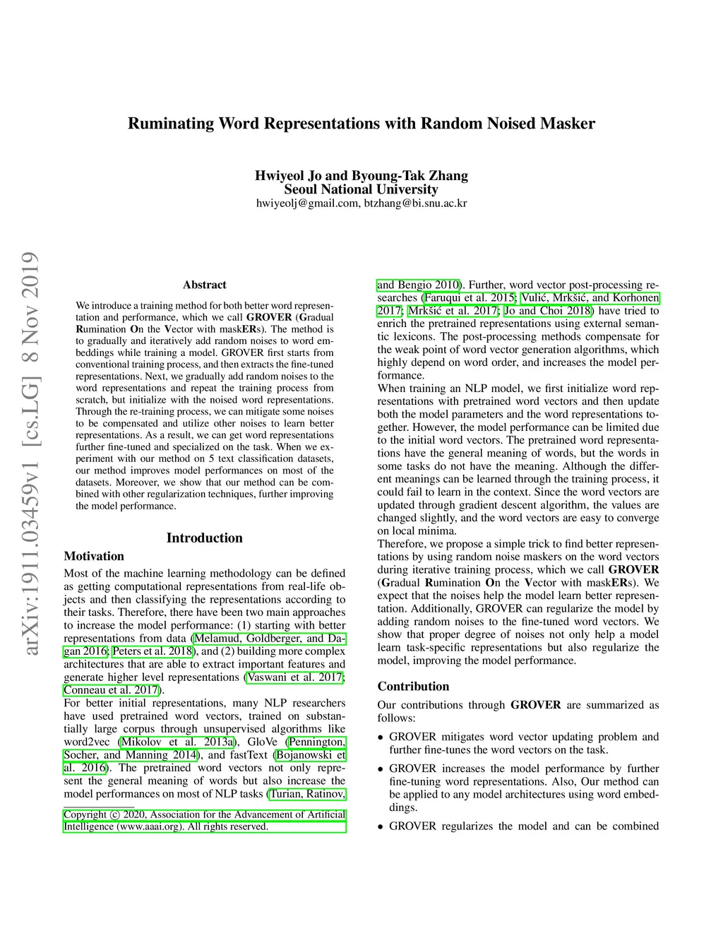We introduce a training method for both better word representation and performance, which we call GROVER (Gradual Rumination On the Vector with maskERs). The method is to gradually and iteratively add random noises to word embeddings while training a model. GROVER first starts from conventional training process, and then extracts the fine-tuned representations. Next, we gradually add random noises to the word representations and repeat the training process from scratch, but initialize with the noised word representations. Through the re-training process, we can mitigate some noises to be compensated and utilize other noises to learn better representations. As a result, we can get word representations further fine-tuned and specialized on the task. When we experiment with our method on 5 text classification datasets, our method improves model performances on most of the datasets. Moreover, we show that our method can be combined with other regularization techniques, further improving the model performance.