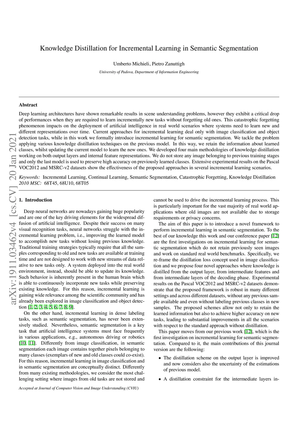 Knowledge Distillation for Incremental Learning in Semantic Segmentation