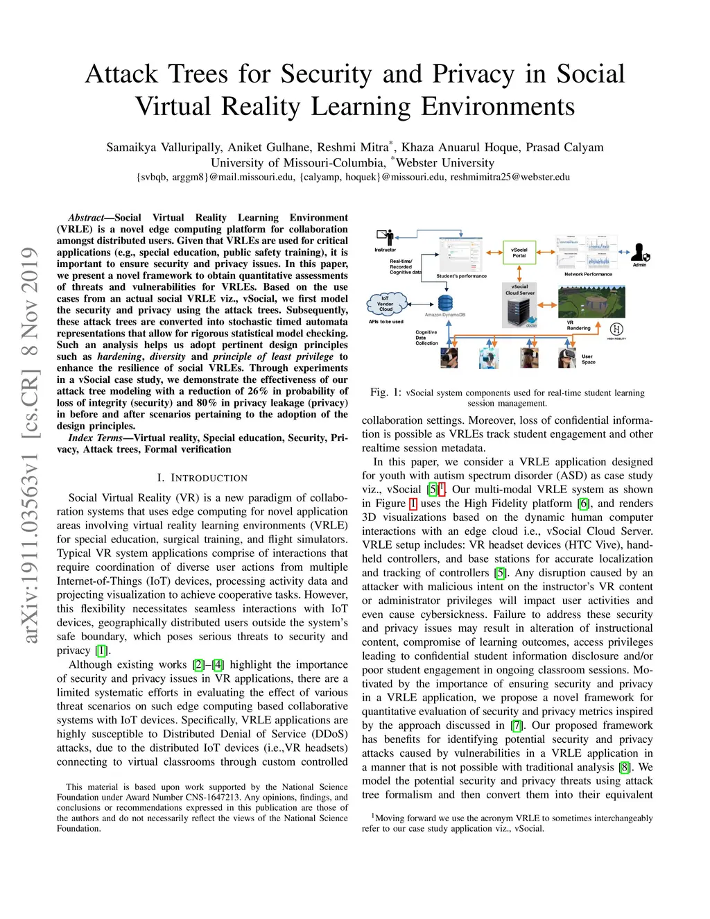 Social Virtual Reality Learning Environment (VRLE) is a novel edge computing platform for collaboration amongst distributed users. Given that VRLEs are used for critical applications (e.g., special education, public safety training), it is important to ensure security and privacy issues. In this paper, we present a novel framework to obtain quantitative assessments of threats and vulnerabilities for VRLEs. Based on the use cases from an actual social VRLE viz., vSocial, we first model the security and privacy using the attack trees. Subsequently, these attack trees are converted into stochastic timed automata representations that allow for rigorous statistical model checking. Such an analysis helps us adopt pertinent design principles such as hardening, diversity and principle of least privilege to enhance the resilience of social VRLEs. Through experiments in a vSocial case study, we demonstrate the effectiveness of our attack tree modeling with a reduction of 26% in probability of loss of integrity (security) and 80% in privacy leakage (privacy) in before and after scenarios pertaining to the adoption of the design principles.