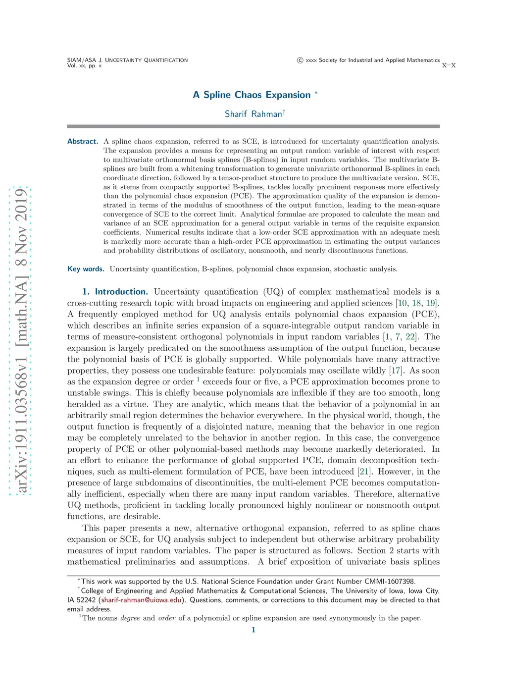 A spline chaos expansion, referred to as SCE, is introduced for uncertainty quantification analysis. The expansion provides a means for representing an output random variable of interest with respect to multivariate orthonormal basis splines (B-splines) in input random variables. The multivariate B-splines are built from a whitening transformation to generate univariate orthonormal B-splines in each coordinate direction, followed by a tensor-product structure to produce the multivariate version. SCE, as it stems from compactly supported B-splines, tackles locally prominent responses more effectively than the polynomial chaos expansion (PCE). The approximation quality of the expansion is demonstrated in terms of the modulus of smoothness of the output function, leading to the mean-square convergence of SCE to the correct limit. Analytical formulae are proposed to calculate the mean and variance of an SCE approximation for a general output variable in terms of the requisite expansion coefficients. Numerical results indicate that a low-order SCE approximation with an adequate mesh is markedly more accurate than a high-order PCE approximation in estimating the output variances and probability distributions of oscillatory, nonsmooth, and nearly discontinuous functions.