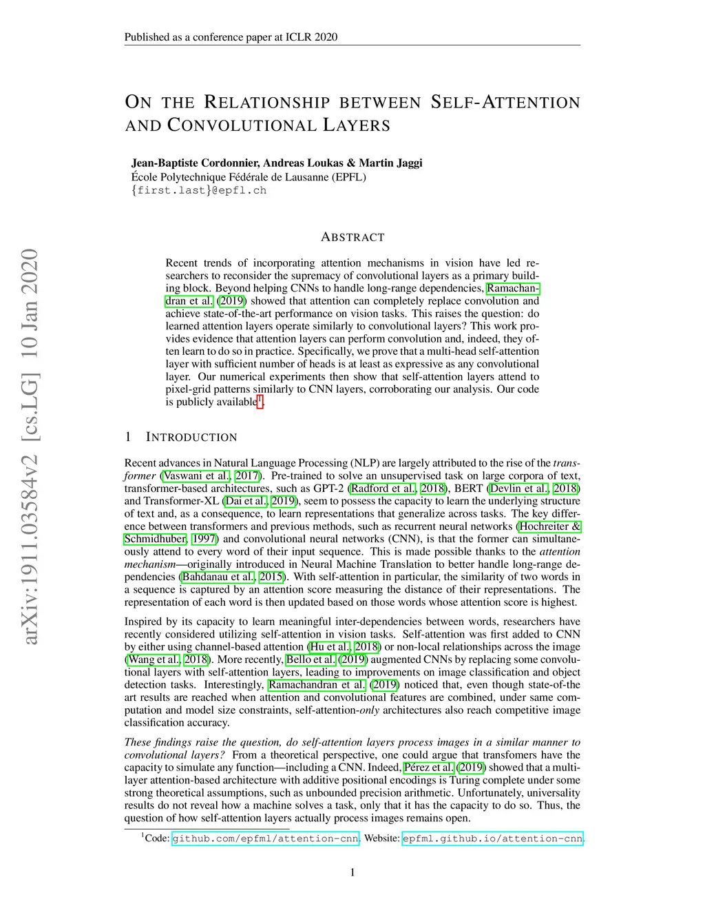 Recent trends of incorporating attention mechanisms in vision have led researchers to reconsider the supremacy of convolutional layers as a primary building block. Beyond helping CNNs to handle long-range dependencies, Ramachandran et al. (2019) showed that attention can completely replace convolution and achieve state-of-the-art performance on vision tasks. This raises the question: do learned attention layers operate similarly to convolutional layers? This work provides evidence that attention layers can perform convolution and, indeed, they often learn to do so in practice. Specifically, we prove that a multi-head self-attention layer with sufficient number of heads is at least as expressive as any convolutional layer. Our numerical experiments then show that self-attention layers attend to pixel-grid patterns similarly to CNN layers, corroborating our analysis. Our code is publicly available.