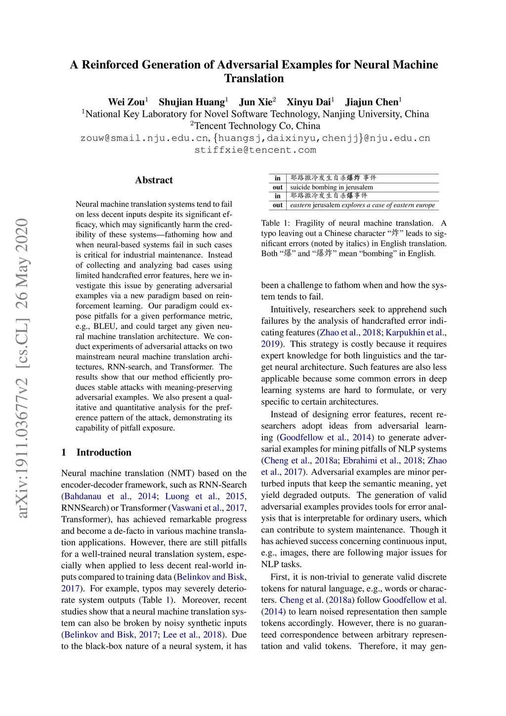 A Reinforced Generation of Adversarial Examples for Neural Machine