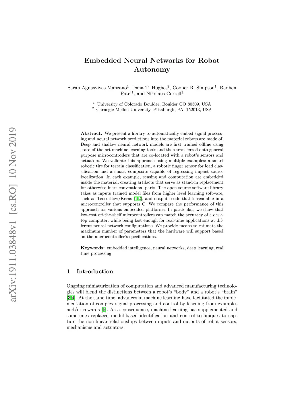 We present a library to automatically embed signal processing and neural network predictions into the material robots are made of. Deep and shallow neural network models are first trained offline using state-of-the-art machine learning tools and then transferred onto general purpose microcontrollers that are co-located with a robot's sensors and actuators. We validate this approach using multiple examples: a smart robotic tire for terrain classification, a robotic finger sensor for load classification and a smart composite capable of regressing impact source localization. In each example, sensing and computation are embedded inside the material, creating artifacts that serve as stand-in replacement for otherwise inert conventional parts. The open source software library takes as inputs trained model files from higher level learning software, such as Tensorflow/Keras, and outputs code that is readable in a microcontroller that supports C. We compare the performance of this approach for various embedded platforms. In particular, we show that low-cost off-the-shelf microcontrollers can match the accuracy of a desktop computer, while being fast enough for real-time applications at different neural network configurations. We provide means to estimate the maximum number of parameters that the hardware will support based on the microcontroller's specifications.