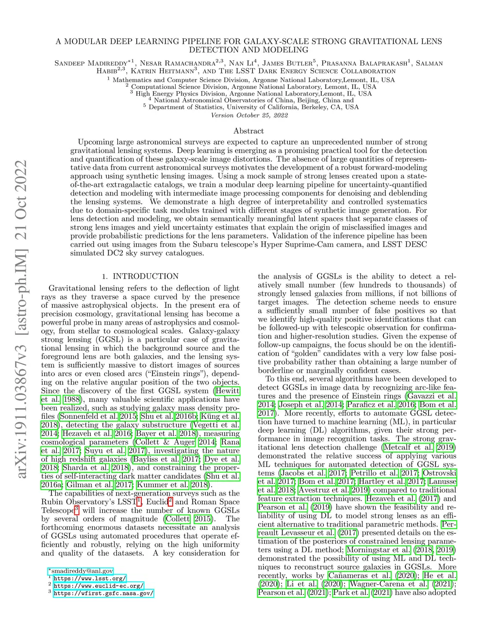 Upcoming large astronomical surveys are expected to capture an unprecedented number of strong gravitational lensing systems in the Universe. Deep learning is emerging as a promising practical tool in detection and quantification of these galaxy-scale image distortions. However, absence of large quantities of representative data from current astronomical surveys requires development of robust forward modeling of synthetic lensing images. Using a realistic and unbiased sample of the strong lenses created by using state-of-the-art extragalactic catalogs, we train a modular deep learning pipeline for uncertainty-quantified detection and modeling with intermediate image processing components for denoising and deblending the lensing systems. We demonstrate a higher degree of interpretability and controlled systematics due to domain-specific task modules that are trained with different stages of synthetic image generation. For lens detection and modeling, we obtain semantically meaningful latent spaces that separate classes and provide uncertainty estimates that explain the misclassified images and provide uncertainty bounds on the lens parameters. In addition, we obtain an improved performance---lens detection (classification) improved from 82% with the baseline to 94%, while the lens modeling (regression) accuracy improved by 25% over the baseline model.