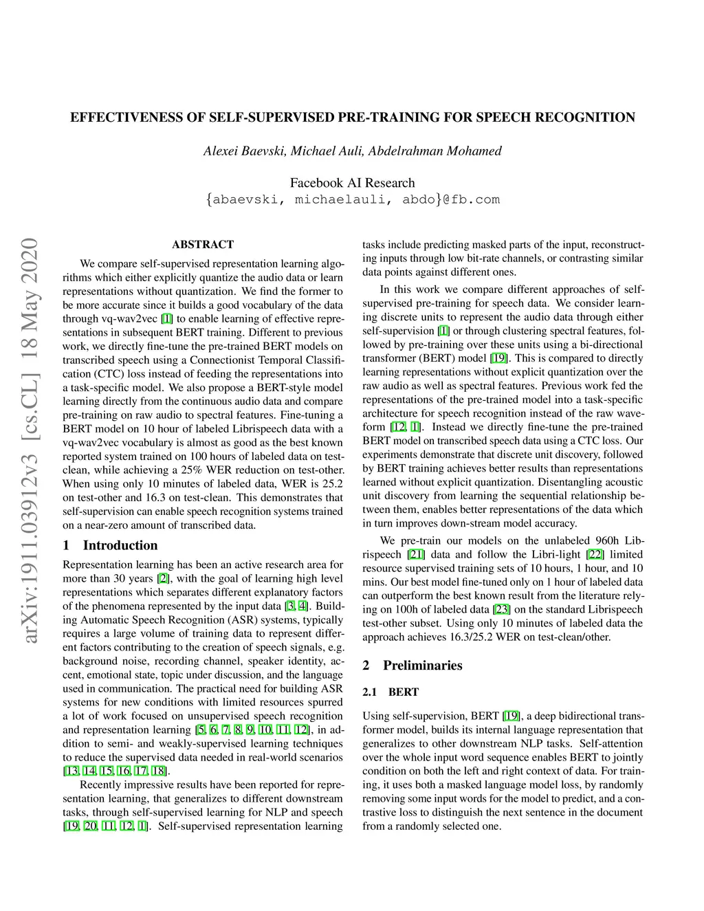 We compare self-supervised representation learning algorithms which either explicitly quantize the audio data or learn representations without quantization. We find the former to be more accurate since it builds a good vocabulary of the data through vq-wav2vec [1] to enable learning of effective representations in subsequent BERT training. Different to previous work, we directly fine-tune the pre-trained BERT models on transcribed speech using a Connectionist Temporal Classification (CTC) loss instead of feeding the representations into a task-specific model. We also propose a BERT-style model learning directly from the continuous audio data and compare pre-training on raw audio to spectral features. Fine-tuning a BERT model on 10 hour of labeled Librispeech data with a vq-wav2vec vocabulary is almost as good as the best known reported system trained on 100 hours of labeled data on testclean, while achieving a 25% WER reduction on test-other. When using only 10 minutes of labeled data, WER is 25.2 on test-other and 16.3 on test-clean. This demonstrates that self-supervision can enable speech recognition systems trained on a near-zero amount of transcribed data.