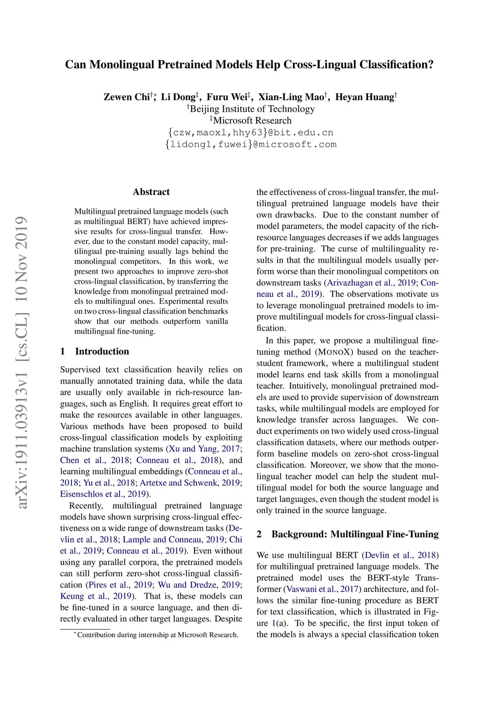 Can Monolingual Pretrained Models Help Cross-Lingual Classification?