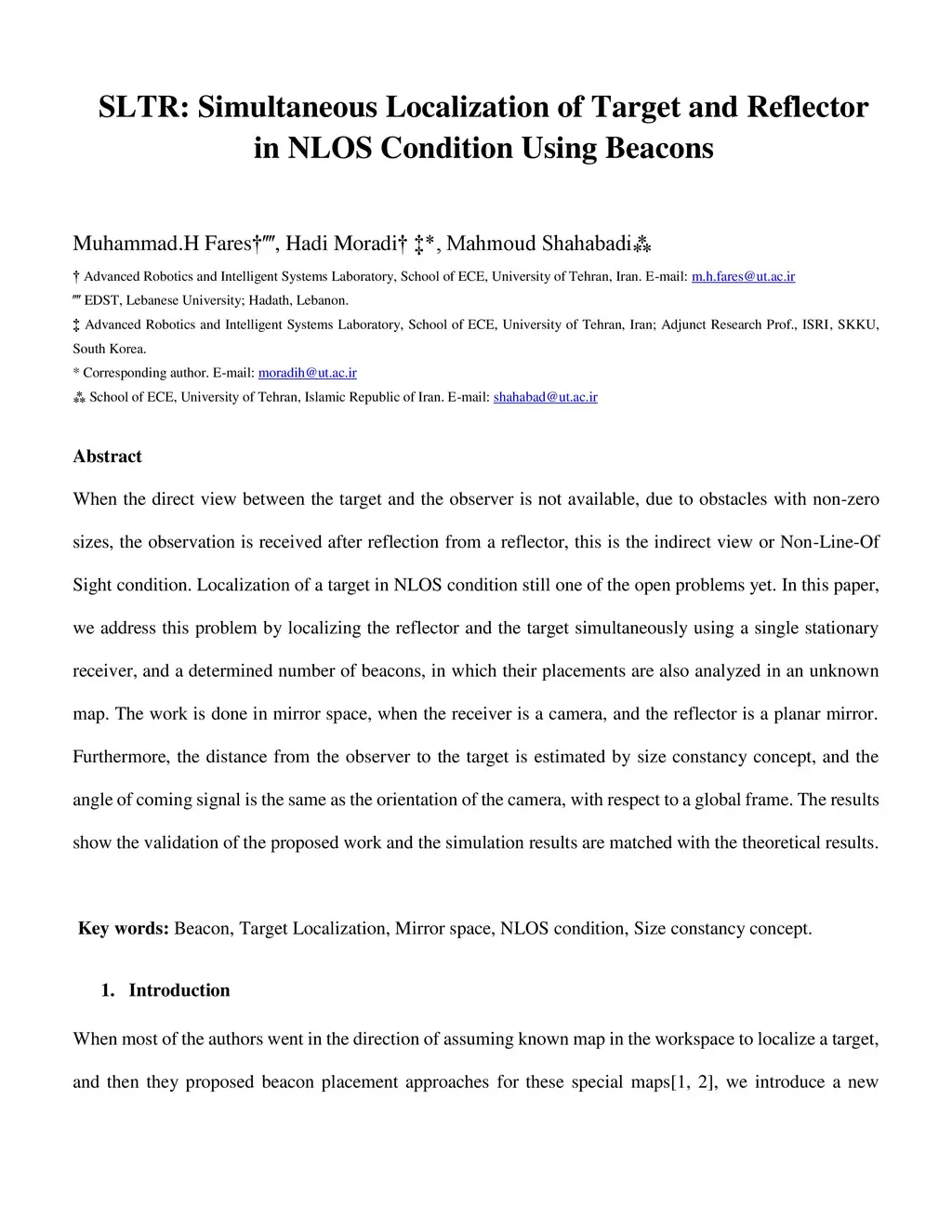 When the direct view between the target and the observer is not available, due to obstacles with non-zero sizes, the observation is received after reflection from a reflector, this is the indirect view or Non-Line-Of Sight condition. Localization of a target in NLOS condition still one of the open problems yet. In this paper, we address this problem by localizing the reflector and the target simultaneously using a single stationary receiver, and a determined number of beacons, in which their placements are also analyzed in an unknown map. The work is done in mirror space, when the receiver is a camera, and the reflector is a planar mirror. Furthermore, the distance from the observer to the target is estimated by size constancy concept, and the angle of coming signal is the same as the orientation of the camera, with respect to a global frame. The results show the validation of the proposed work and the simulation results are matched with the theoretical results.