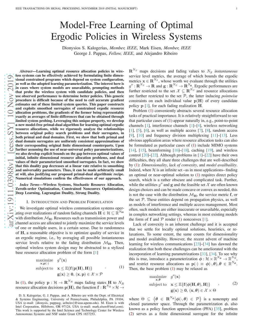 Learning optimal resource allocation policies in wireless systems can be effectively achieved by formulating finite dimensional constrained programs which depend on system configuration, as well as the adopted learning parameterization. The interest here is in cases where system models are unavailable, prompting methods that probe the wireless system with candidate policies, and then use observed performance to determine better policies. This generic procedure is difficult because of the need to cull accurate gradient estimates out of these limited system queries. This paper constructs and exploits smoothed surrogates of constrained ergodic resource allocation problems, the gradients of the former being representable exactly as averages of finite differences that can be obtained through limited system probing. Leveraging this unique property, we develop a new model-free primal-dual algorithm for learning optimal ergodic resource allocations, while we rigorously analyze the relationships between original policy search problems and their surrogates, in both primal and dual domains. First, we show that both primal and dual domain surrogates are uniformly consistent approximations of their corresponding original finite dimensional counterparts. Upon further assuming the use of near-universal policy parameterizations, we also develop explicit bounds on the gap between optimal values of initial, infinite dimensional resource allocation problems, and dual values of their parameterized smoothed surrogates. In fact, we show that this duality gap decreases at a linear rate relative to smoothing and universality parameters. Thus, it can be made arbitrarily small at will, also justifying our proposed primal-dual algorithmic recipe. Numerical simulations confirm the effectiveness of our approach.