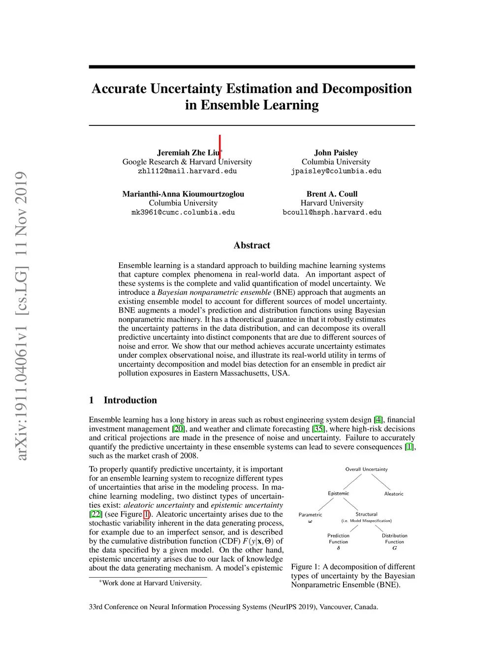 Ensemble learning is a standard approach to building machine learning systems that capture complex phenomena in real-world data. An important aspect of these systems is the complete and valid quantification of model uncertainty. We introduce a Bayesian nonparametric ensemble (BNE) approach that augments an existing ensemble model to account for different sources of model uncertainty. BNE augments a model's prediction and distribution functions using Bayesian nonparametric machinery. It has a theoretical guarantee in that it robustly estimates the uncertainty patterns in the data distribution, and can decompose its overall predictive uncertainty into distinct components that are due to different sources of noise and error. We show that our method achieves accurate uncertainty estimates under complex observational noise, and illustrate its real-world utility in terms of uncertainty decomposition and model bias detection for an ensemble in predict air pollution exposures in Eastern Massachusetts, USA.