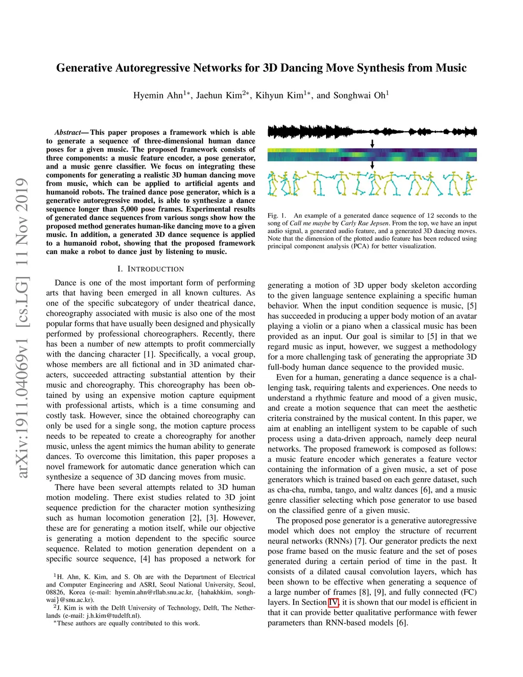 This paper proposes a framework which is able to generate a sequence of three-dimensional human dance poses for a given music. The proposed framework consists of three components: a music feature encoder, a pose generator, and a music genre classifier. We focus on integrating these components for generating a realistic 3D human dancing move from music, which can be applied to artificial agents and humanoid robots. The trained dance pose generator, which is a generative autoregressive model, is able to synthesize a dance sequence longer than 5,000 pose frames. Experimental results of generated dance sequences from various songs show how the proposed method generates human-like dancing move to a given music. In addition, a generated 3D dance sequence is applied to a humanoid robot, showing that the proposed framework can make a robot to dance just by listening to music.