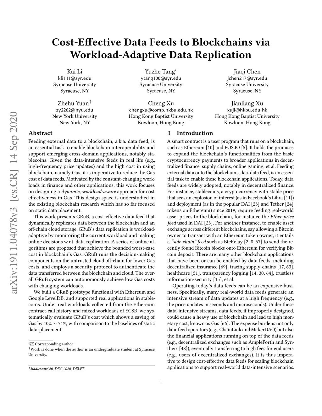 Feeding external data to a blockchain, a.k.a. data feed, is an essential task to enable blockchain interoperability and support emerging cross-domain applications, notably stablecoins. Given the data-intensive feeds in real life (e.g., high-frequency price updates) and the high cost in using blockchain, namely Gas, it is imperative to reduce the Gas cost of data feeds. Motivated by the constant-changing workloads in finance and other applications, this work focuses on designing a dynamic, workload-aware approach for cost effectiveness in Gas. This design space is understudied in the existing blockchain research which has so far focused on static data placement. This work presents GRuB, a cost-effective data feed that dynamically replicates data between the blockchain and an off-chain cloud storage. GRuB's data replication is workload-adaptive by monitoring the current workload and making online decisions w.r.t. data replication. A series of online algorithms are proposed that achieve the bounded worst-case cost in blockchain's Gas. GRuB runs the decision-making components on the untrusted cloud off-chain for lower Gas costs, and employs a security protocol to authenticate the data transferred between the blockchain and cloud. The overall GRuB system can autonomously achieve low Gas costs with changing workloads. We built a GRuB prototype functional with Ethereum and Google LevelDB, and supported real applications in stablecoins. Under real workloads collected from the Ethereum contract-call history and mixed workloads of YCSB, we systematically evaluate GRuB's cost which shows a saving of Gas by 10% ~ 74%, with comparison to the baselines of static data-placement.