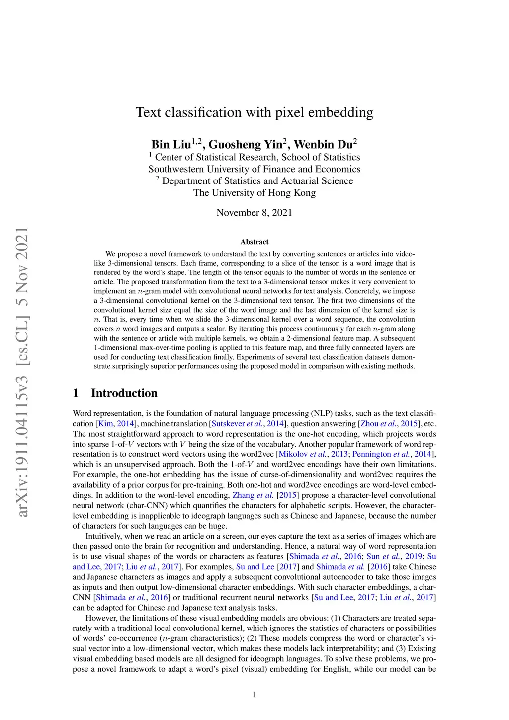 Text classification with pixel embedding