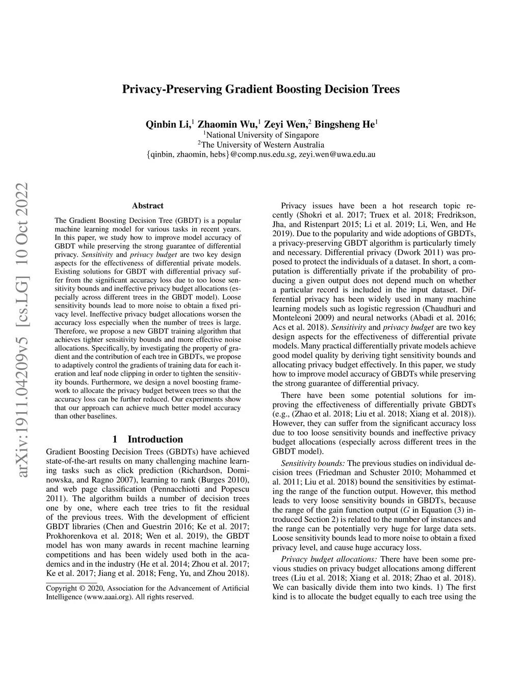 The Gradient Boosting Decision Tree (GBDT) is a popular machine learning model for various tasks in recent years. In this paper, we study how to improve model accuracy of GBDT while preserving the strong guarantee of differential privacy. Sensitivity and privacy budget are two key design aspects for the effectiveness of differential private models. Existing solutions for GBDT with differential privacy suffer from the significant accuracy loss due to too loose sensitivity bounds and ineffective privacy budget allocations (especially across different trees in the GBDT model). Loose sensitivity bounds lead to more noise to obtain a fixed privacy level. Ineffective privacy budget allocations worsen the accuracy loss especially when the number of trees is large. Therefore, we propose a new GBDT training algorithm that achieves tighter sensitivity bounds and more effective noise allocations. Specifically, by investigating the property of gradient and the contribution of each tree in GBDTs, we propose to adaptively control the gradients of training data for each iteration and leaf node clipping in order to tighten the sensitivity bounds. Furthermore, we design a novel boosting framework to allocate the privacy budget between trees so that the accuracy loss can be further reduced. Our experiments show that our approach can achieve much better model accuracy than other baselines.
