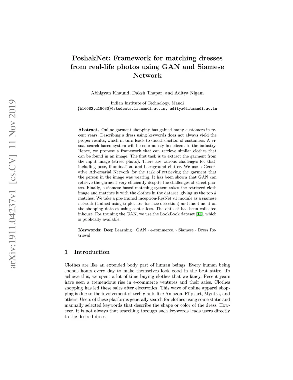 Online garment shopping has gained many customers in recent years. Describing a dress using keywords does not always yield the proper results, which in turn leads to dissatisfaction of customers. A visual search based system will be enormously beneficent to the industry. Hence, we propose a framework that can retrieve similar clothes that can be found in an image. The first task is to extract the garment from the input image (street photo). There are various challenges for that, including pose, illumination, and background clutter. We use a Generative Adversarial Network for the task of retrieving the garment that the person in the image was wearing. It has been shown that GAN can retrieve the garment very efficiently despite the challenges of street photos. Finally, a siamese based matching system takes the retrieved cloth image and matches it with the clothes in the dataset, giving us the top k matches. We take a pre-trained inception-ResNet v1 module as a siamese network (trained using triplet loss for face detection) and fine-tune it on the shopping dataset using center loss. The dataset has been collected inhouse. For training the GAN, we use the LookBook dataset, which is publically available.