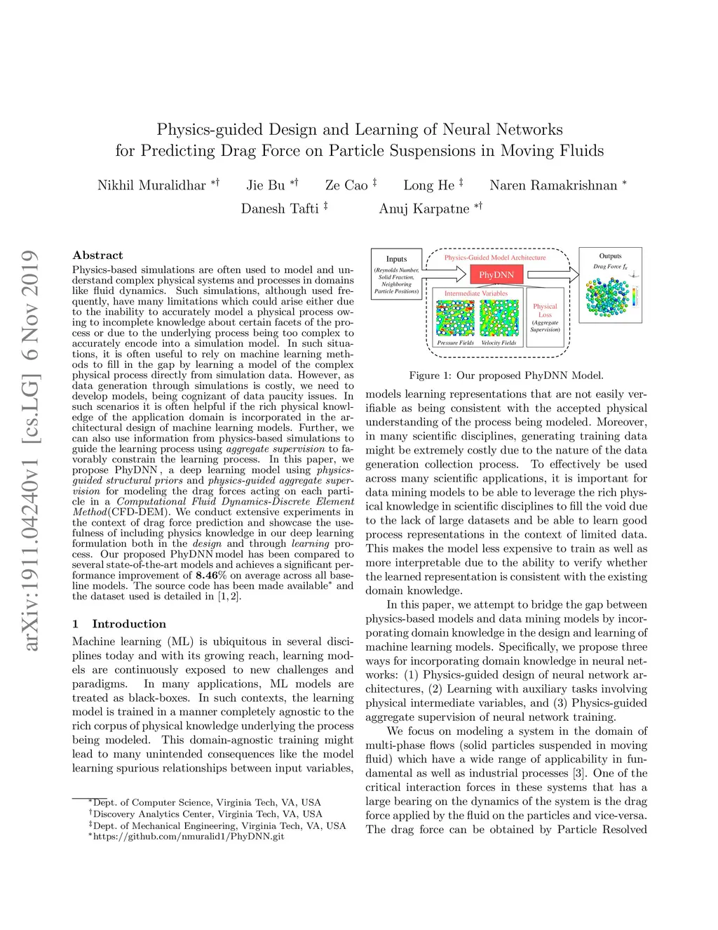 Physics-based simulations are often used to model and understand complex physical systems and processes in domains like fluid dynamics. Such simulations, although used frequently, have many limitations which could arise either due to the inability to accurately model a physical process owing to incomplete knowledge about certain facets of the process or due to the underlying process being too complex to accurately encode into a simulation model. In such situations, it is often useful to rely on machine learning methods to fill in the gap by learning a model of the complex physical process directly from simulation data. However, as data generation through simulations is costly, we need to develop models, being cognizant of data paucity issues. In such scenarios it is often helpful if the rich physical knowledge of the application domain is incorporated in the architectural design of machine learning models. Further, we can also use information from physics-based simulations to guide the learning process using aggregate supervision to favorably constrain the learning process. In this paper, we propose PhyDNN, a deep learning model using physics-guided structural priors and physics-guided aggregate supervision for modeling the drag forces acting on each particle in a Computational Fluid Dynamics-Discrete Element Method(CFD-DEM). We conduct extensive experiments in the context of drag force prediction and showcase the usefulness of including physics knowledge in our deep learning formulation both in the design and through learning process. Our proposed PhyDNN model has been compared to several state-of-the-art models and achieves a significant performance improvement of 8.46% on average across all baseline models. The source code has been made available and the dataset used is detailed in [1, 2].