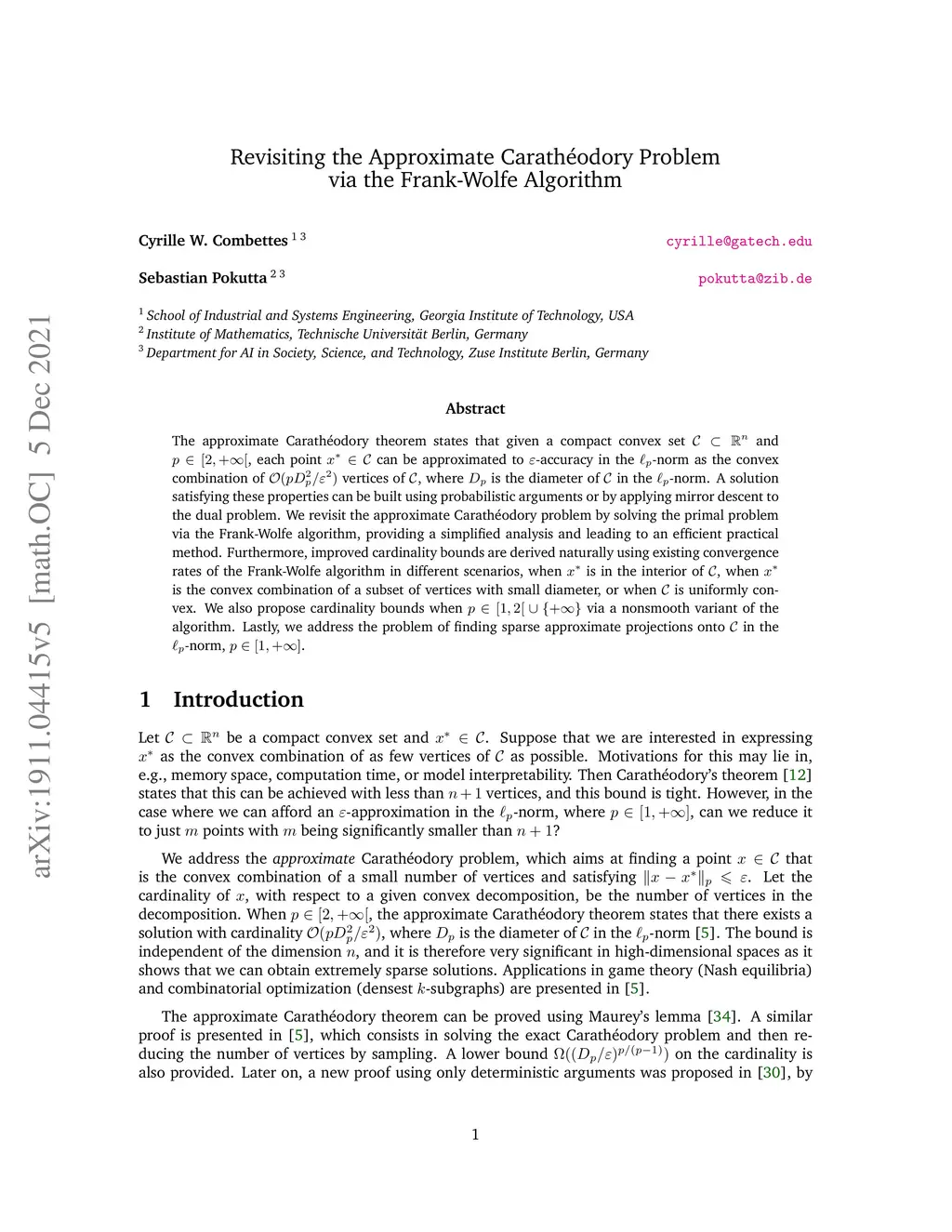The approximate Carath\éodory theorem states that given a compact convex set and , each point can be approximated to -accuracy in the -norm as the convex combination of vertices of , where is the diameter of in the -norm. A solution satisfying these properties can be built using probabilistic arguments or by applying mirror descent to the dual problem. We revisit the approximate Carath\éodory problem by solving the primal problem via the Frank-Wolfe algorithm, providing a simplified analysis and leading to an efficient practical method. Furthermore, improved cardinality bounds are derived naturally using existing convergence rates of the Frank-Wolfe algorithm in different scenarios, when is in the interior of , when is the convex combination of a subset of vertices with small diameter, or when is uniformly convex. We also propose cardinality bounds when via a nonsmooth variant of the algorithm. Lastly, we address the problem of finding sparse approximate projections onto in the -norm, .