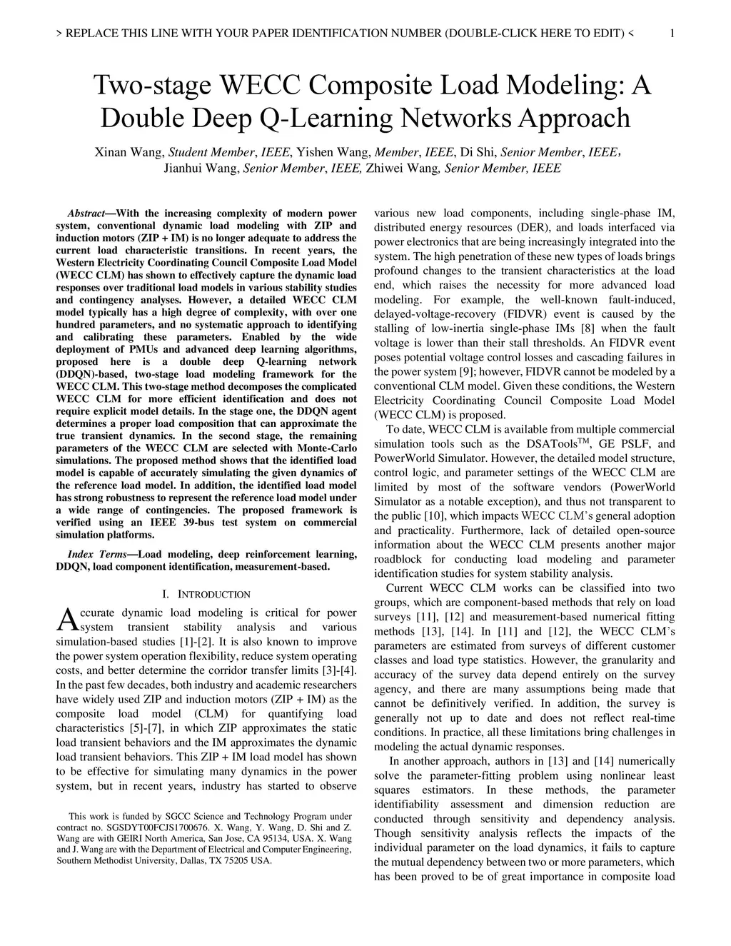 Two-stage WECC Composite Load Modeling: A Double Deep Q-Learning