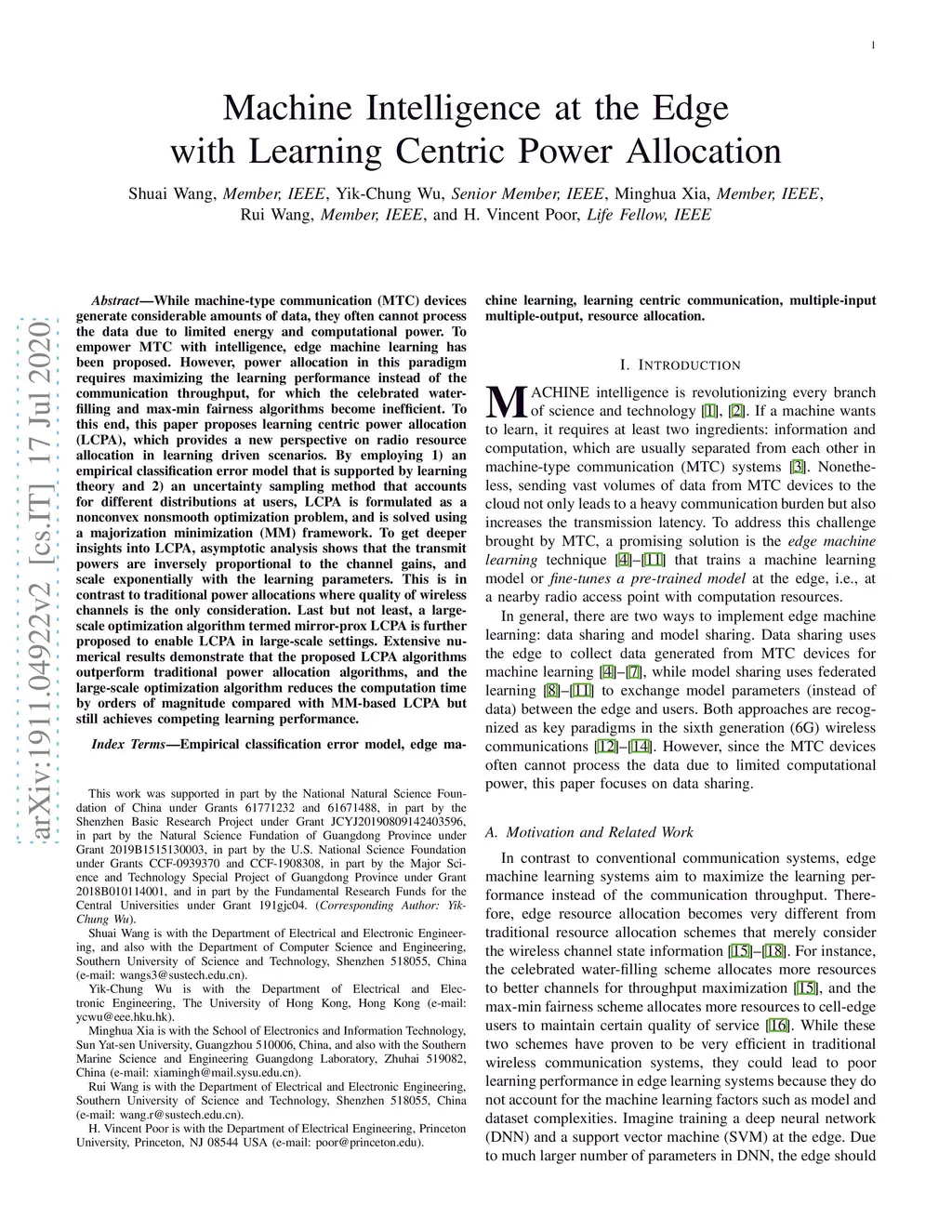 While machine-type communication (MTC) devices generate considerable amounts of data, they often cannot process the data due to limited energy and computational power. To empower MTC with intelligence, edge machine learning has been proposed. However, power allocation in this paradigm requires maximizing the learning performance instead of the communication throughput, for which the celebrated water-filling and max-min fairness algorithms become inefficient. To this end, this paper proposes learning centric power allocation (LCPA), which provides a new perspective on radio resource allocation in learning driven scenarios. By employing 1) an empirical classification error model that is supported by learning theory and 2) an uncertainty sampling method that accounts for different distributions at users, LCPA is formulated as a nonconvex nonsmooth optimization problem, and is solved using a majorization minimization (MM) framework. To get deeper insights into LCPA, asymptotic analysis shows that the transmit powers are inversely proportional to the channel gains, and scale exponentially with the learning parameters. This is in contrast to traditional power allocations where quality of wireless channels is the only consideration. Last but not least, a large-scale optimization algorithm termed mirror-prox LCPA is further proposed to enable LCPA in large-scale settings. Extensive numerical results demonstrate that the proposed LCPA algorithms outperform traditional power allocation algorithms, and the large-scale optimization algorithm reduces the computation time by orders of magnitude compared with MM-based LCPA but still achieves competing learning performance.