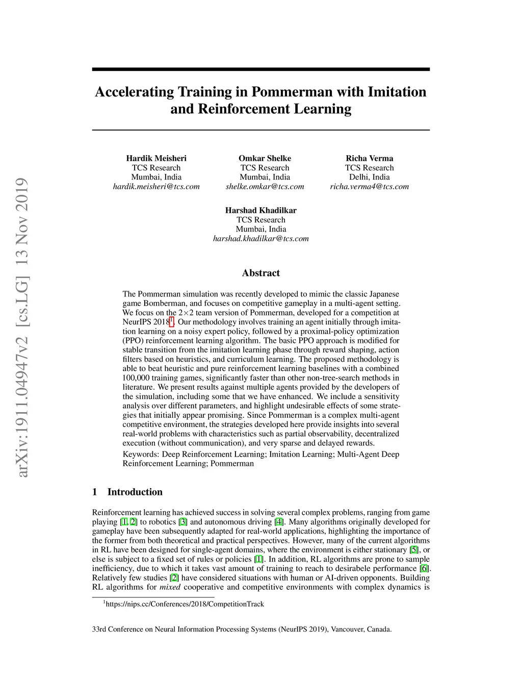 The Pommerman simulation was recently developed to mimic the classic Japanese game Bomberman, and focuses on competitive gameplay in a multi-agent setting. We focus on the 22 team version of Pommerman, developed for a competition at NeurIPS 2018. Our methodology involves training an agent initially through imitation learning on a noisy expert policy, followed by a proximal-policy optimization (PPO) reinforcement learning algorithm. The basic PPO approach is modified for stable transition from the imitation learning phase through reward shaping, action filters based on heuristics, and curriculum learning. The proposed methodology is able to beat heuristic and pure reinforcement learning baselines with a combined 100,000 training games, significantly faster than other non-tree-search methods in literature. We present results against multiple agents provided by the developers of the simulation, including some that we have enhanced. We include a sensitivity analysis over different parameters, and highlight undesirable effects of some strategies that initially appear promising. Since Pommerman is a complex multi-agent competitive environment, the strategies developed here provide insights into several real-world problems with characteristics such as partial observability, decentralized execution (without communication), and very sparse and delayed rewards.
