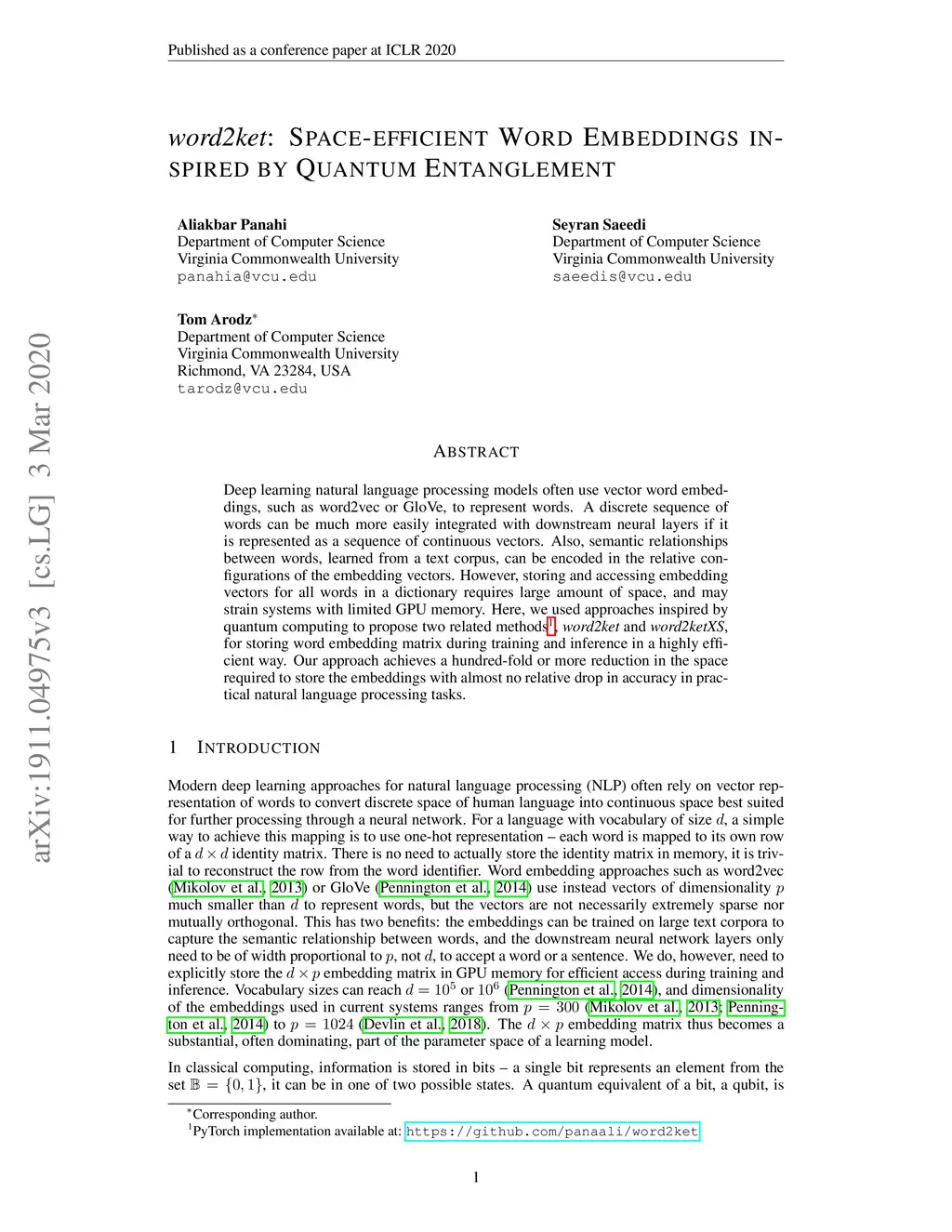word2ket: Space-efficient Word Embeddings inspired by Quantum