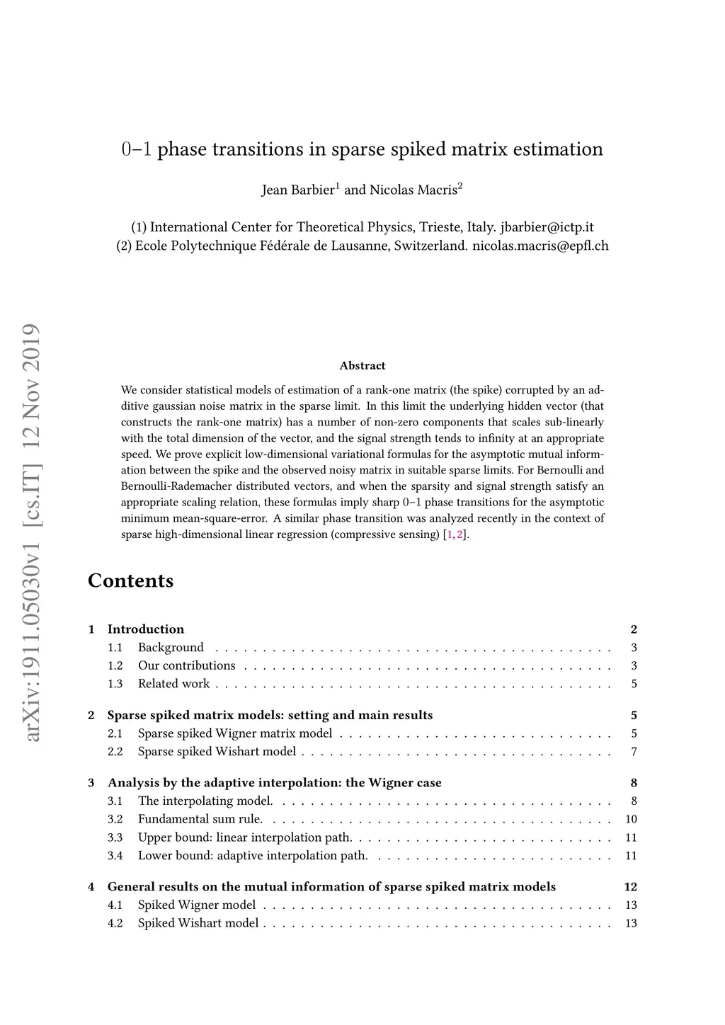 We consider statistical models of estimation of a rank-one matrix (the spike) corrupted by an additive gaussian noise matrix in the sparse limit. In this limit the underlying hidden vector (that constructs the rank-one matrix) has a number of non-zero components that scales sub-linearly with the total dimension of the vector, and the signal strength tends to infinity at an appropriate speed. We prove explicit low-dimensional variational formulas for the asymptotic mutual information between the spike and the observed noisy matrix in suitable sparse limits. For Bernoulli and Bernoulli-Rademacher distributed vectors, and when the sparsity and signal strength satisfy an appropriate scaling relation, these formulas imply sharp 0-1 phase transitions for the asymptotic minimum mean-square-error. A similar phase transition was analyzed recently in the context of sparse high-dimensional linear regression (compressive sensing).