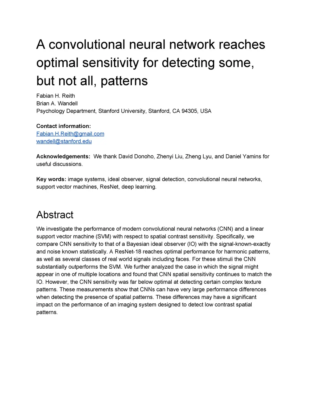 We investigate the performance of modern convolutional neural networks (CNN) and a linear support vector machine (SVM) with respect to spatial contrast sensitivity. Specifically, we compare CNN sensitivity to that of a Bayesian ideal observer (IO) with the signal-known-exactly and noise known statistically. A ResNet-18 reaches optimal performance for harmonic patterns, as well as several classes of real world signals including faces. For these stimuli the CNN substantially outperforms the SVM. We further analyzed the case in which the signal might appear in one of multiple locations and found that CNN spatial sensitivity continues to match the IO. However, the CNN sensitivity was far below optimal at detecting certain complex texture patterns. These measurements show that CNNs can have very large performance differences when detecting the presence of spatial patterns. These differences may have a significant impact on the performance of an imaging system designed to detect low contrast spatial patterns.
