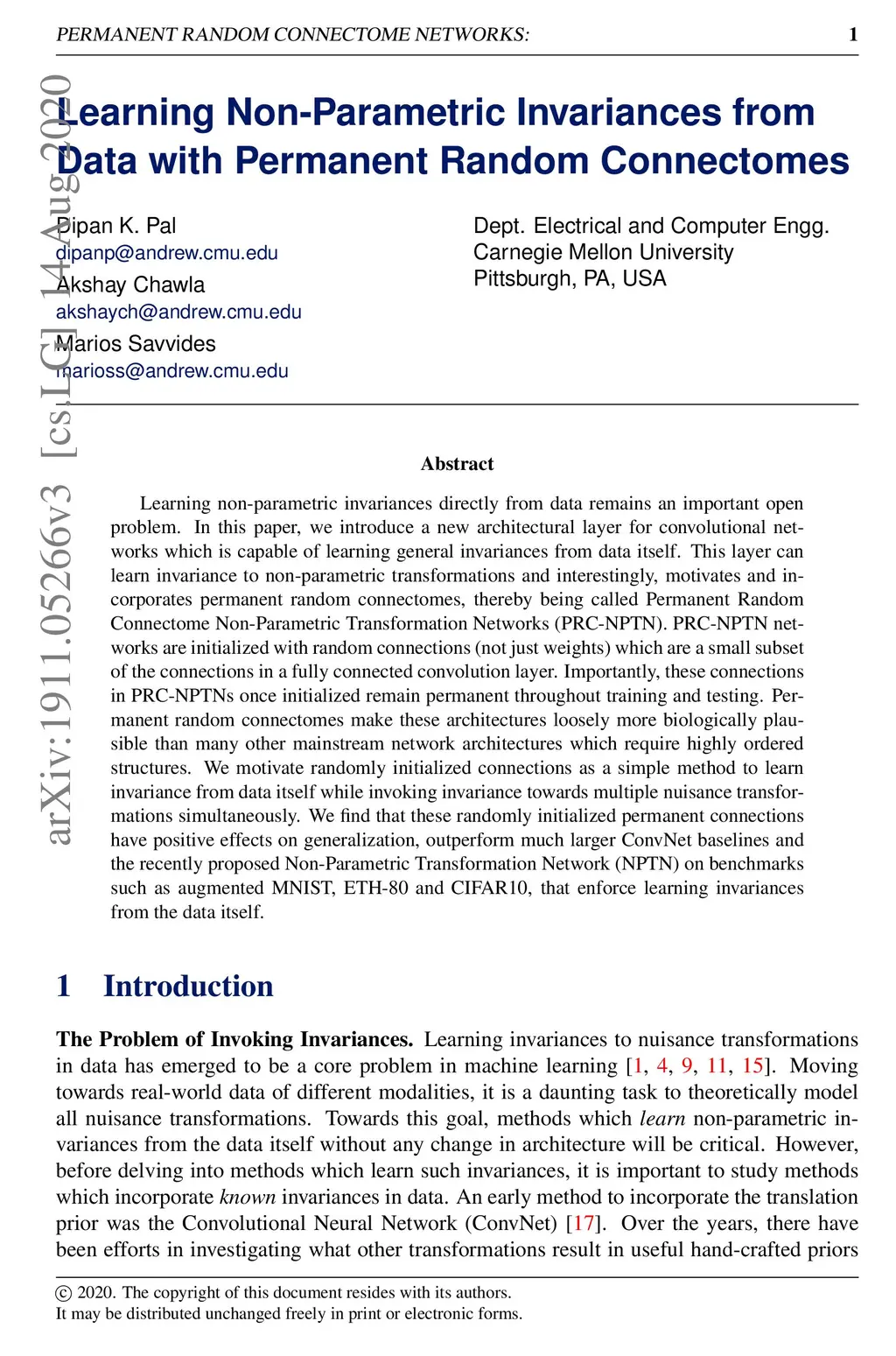 One of the fundamental problems in supervised classification and in machine learning in general, is the modelling of non-parametric invariances that exist in data. Most prior art has focused on enforcing priors in the form of invariances to parametric nuisance transformations that are expected to be present in data. Learning non-parametric invariances directly from data remains an important open problem. In this paper, we introduce a new architectural layer for convolutional networks which is capable of learning general invariances from data itself. This layer can learn invariance to non-parametric transformations and interestingly, motivates and incorporates permanent random connectomes, thereby being called Permanent Random Connectome Non-Parametric Transformation Networks (PRC-NPTN). PRC-NPTN networks are initialized with random connections (not just weights) which are a small subset of the connections in a fully connected convolution layer. Importantly, these connections in PRC-NPTNs once initialized remain permanent throughout training and testing. Permanent random connectomes make these architectures loosely more biologically plausible than many other mainstream network architectures which require highly ordered structures. We motivate randomly initialized connections as a simple method to learn invariance from data itself while invoking invariance towards multiple nuisance transformations simultaneously. We find that these randomly initialized permanent connections have positive effects on generalization, outperform much larger ConvNet baselines and the recently proposed Non-Parametric Transformation Network (NPTN) on benchmarks that enforce learning invariances from the data itself.