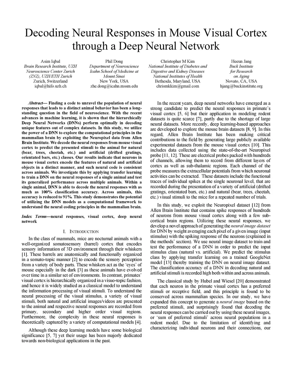 Finding a code to unravel the population of neural responses that leads to a distinct animal behavior has been a long-standing question in the field of neuroscience. With the recent advances in machine learning, it is shown that the hierarchically Deep Neural Networks (DNNs) perform optimally in decoding unique features out of complex datasets. In this study, we utilize the power of a DNN to explore the computational principles in the mammalian brain by exploiting the Neuropixel data from Allen Brain Institute. We decode the neural responses from mouse visual cortex to predict the presented stimuli to the animal for natural (bear, trees, cheetah, etc.) and artificial (drifted gratings, orientated bars, etc.) classes. Our results indicate that neurons in mouse visual cortex encode the features of natural and artificial objects in a distinct manner, and such neural code is consistent across animals. We investigate this by applying transfer learning to train a DNN on the neural responses of a single animal and test its generalized performance across multiple animals. Within a single animal, DNN is able to decode the neural responses with as much as 100% classification accuracy. Across animals, this accuracy is reduced to 91%. This study demonstrates the potential of utilizing the DNN models as a computational framework to understand the neural coding principles in the mammalian brain.