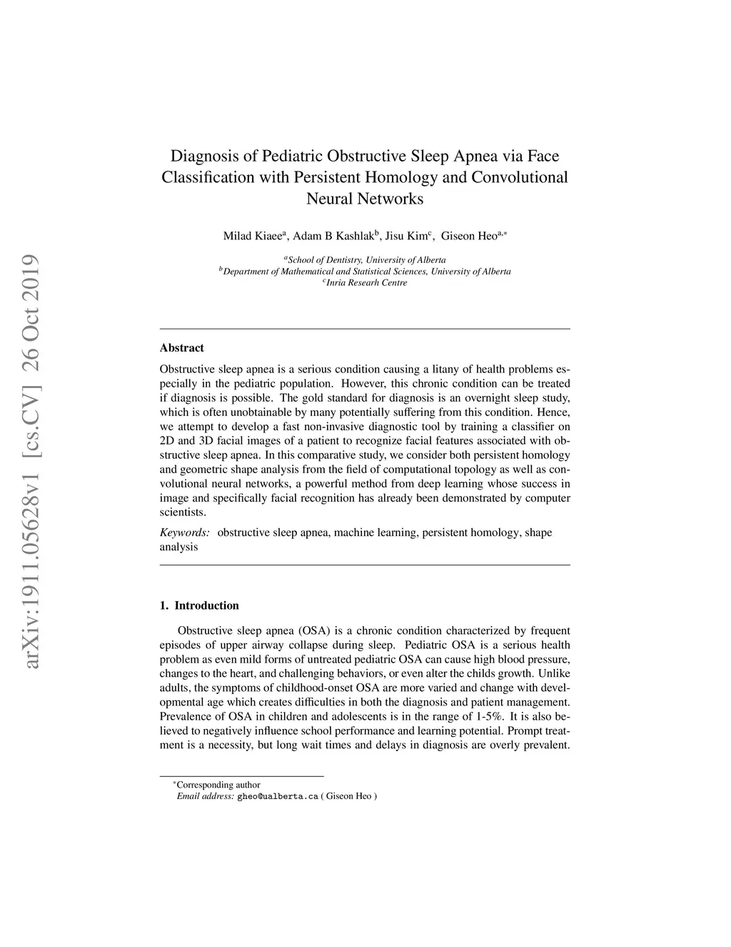 Obstructive sleep apnea is a serious condition causing a litany of health problems especially in the pediatric population. However, this chronic condition can be treated if diagnosis is possible. The gold standard for diagnosis is an overnight sleep study, which is often unobtainable by many potentially suffering from this condition. Hence, we attempt to develop a fast non-invasive diagnostic tool by training a classifier on 2D and 3D facial images of a patient to recognize facial features associated with obstructive sleep apnea. In this comparative study, we consider both persistent homology and geometric shape analysis from the field of computational topology as well as convolutional neural networks, a powerful method from deep learning whose success in image and specifically facial recognition has already been demonstrated by computer scientists.