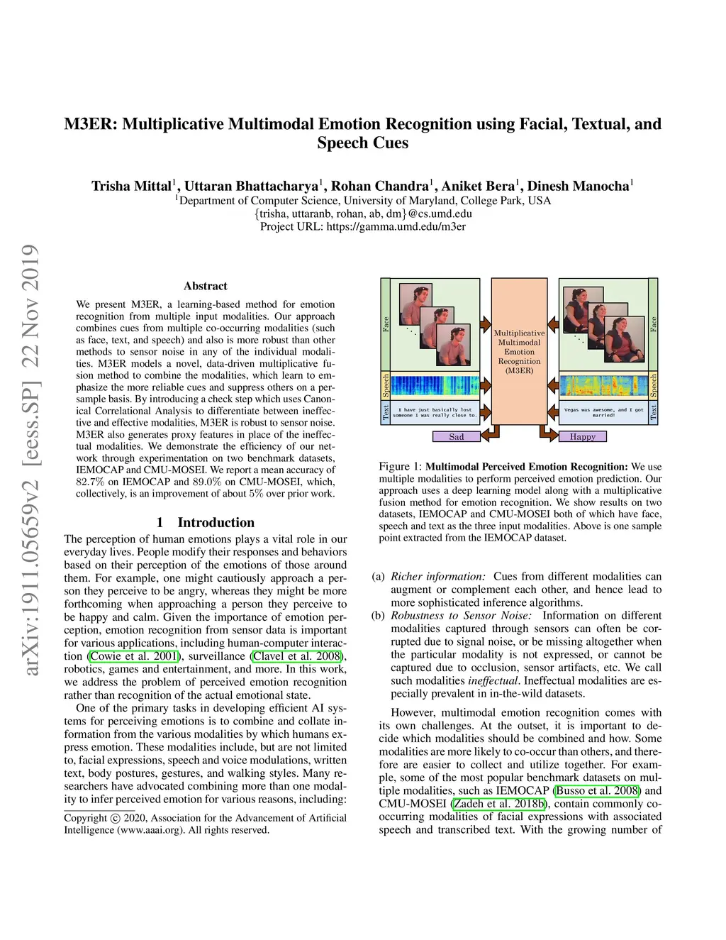 We present M3ER, a learning-based method for emotion recognition from multiple input modalities. Our approach combines cues from multiple co-occurring modalities (such as face, text, and speech) and also is more robust than other methods to sensor noise in any of the individual modalities. M3ER models a novel, data-driven multiplicative fusion method to combine the modalities, which learn to emphasize the more reliable cues and suppress others on a per-sample basis. By introducing a check step which uses Canonical Correlational Analysis to differentiate between ineffective and effective modalities, M3ER is robust to sensor noise. M3ER also generates proxy features in place of the ineffectual modalities. We demonstrate the efficiency of our network through experimentation on two benchmark datasets, IEMOCAP and CMU-MOSEI. We report a mean accuracy of 82.7% on IEMOCAP and 89.0% on CMU-MOSEI, which, collectively, is an improvement of about 5% over prior work.