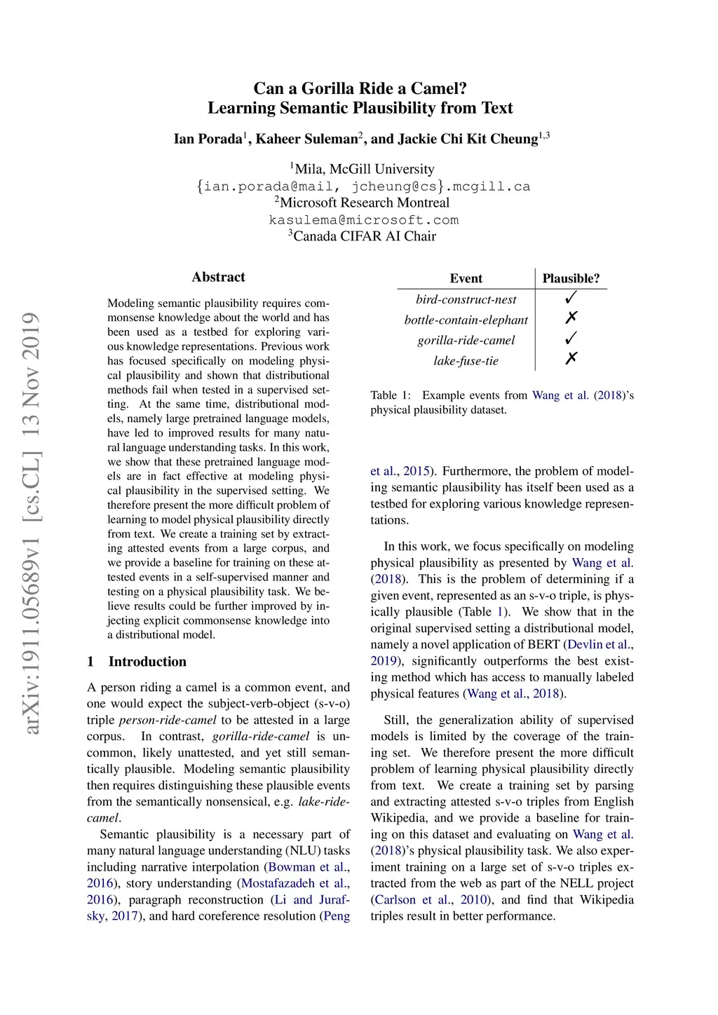 Can a Gorilla Ride a Camel? Learning Semantic Plausibility from Text