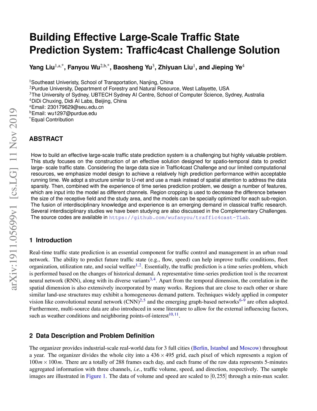 How to build an effective large-scale traffic state prediction system is a challenging but highly valuable problem. This study focuses on the construction of an effective solution designed for spatio-temporal data to predict large-scale traffic state. Considering the large data size in Traffic4cast Challenge and our limited computational resources, we emphasize model design to achieve a relatively high prediction performance within acceptable running time. We adopt a structure similar to U-net and use a mask instead of spatial attention to address the data sparsity. Then, combined with the experience of time series prediction problem, we design a number of features, which are input into the model as different channels. Region cropping is used to decrease the difference between the size of the receptive field and the study area, and the models can be specially optimized for each sub-region. The fusion of interdisciplinary knowledge and experience is an emerging demand in classical traffic research. Several interdisciplinary studies we have been studying are also discussed in the Complementary Challenges. The source codes are available in https://github.com/wufanyou/traffic4cast-TLab.