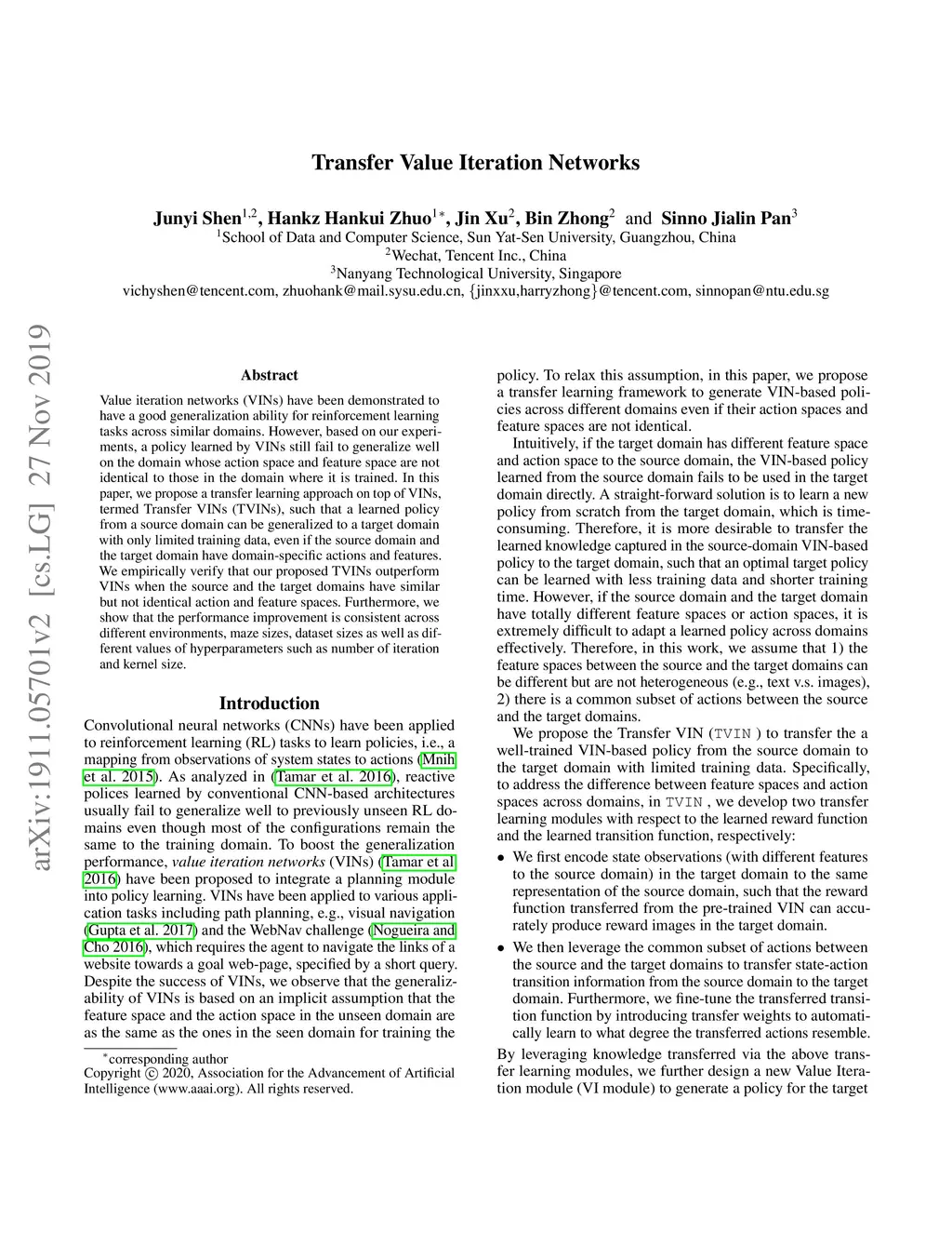 Value iteration networks (VINs) have been demonstrated to have a good generalization ability for reinforcement learning tasks across similar domains. However, based on our experiments, a policy learned by VINs still fail to generalize well on the domain whose action space and feature space are not identical to those in the domain where it is trained. In this paper, we propose a transfer learning approach on top of VINs, termed Transfer VINs (TVINs), such that a learned policy from a source domain can be generalized to a target domain with only limited training data, even if the source domain and the target domain have domain-specific actions and features. We empirically verify that our proposed TVINs outperform VINs when the source and the target domains have similar but not identical action and feature spaces. Furthermore, we show that the performance improvement is consistent across different environments, maze sizes, dataset sizes as well as different values of hyperparameters such as number of iteration and kernel size.