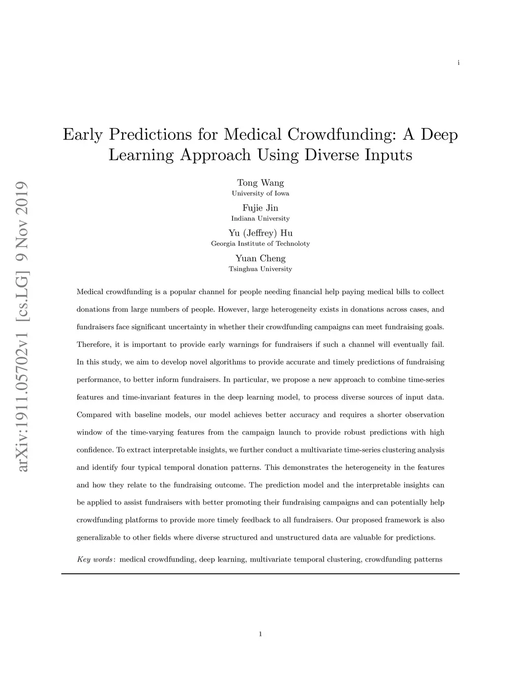 Medical crowdfunding is a popular channel for people needing financial help paying medical bills to collect donations from large numbers of people. However, large heterogeneity exists in donations across cases, and fundraisers face significant uncertainty in whether their crowdfunding campaigns can meet fundraising goals. Therefore, it is important to provide early warnings for fundraisers if such a channel will eventually fail. In this study, we aim to develop novel algorithms to provide accurate and timely predictions of fundraising performance, to better inform fundraisers. In particular, we propose a new approach to combine time-series features and time-invariant features in the deep learning model, to process diverse sources of input data. Compared with baseline models, our model achieves better accuracy and requires a shorter observation window of the time-varying features from the campaign launch to provide robust predictions with high confidence. To extract interpretable insights, we further conduct a multivariate time-series clustering analysis and identify four typical temporal donation patterns. This demonstrates the heterogeneity in the features and how they relate to the fundraising outcome. The prediction model and the interpretable insights can be applied to assist fundraisers with better promoting their fundraising campaigns and can potentially help crowdfunding platforms to provide more timely feedback to all fundraisers. Our proposed framework is also generalizable to other fields where diverse structured and unstructured data are valuable for predictions.