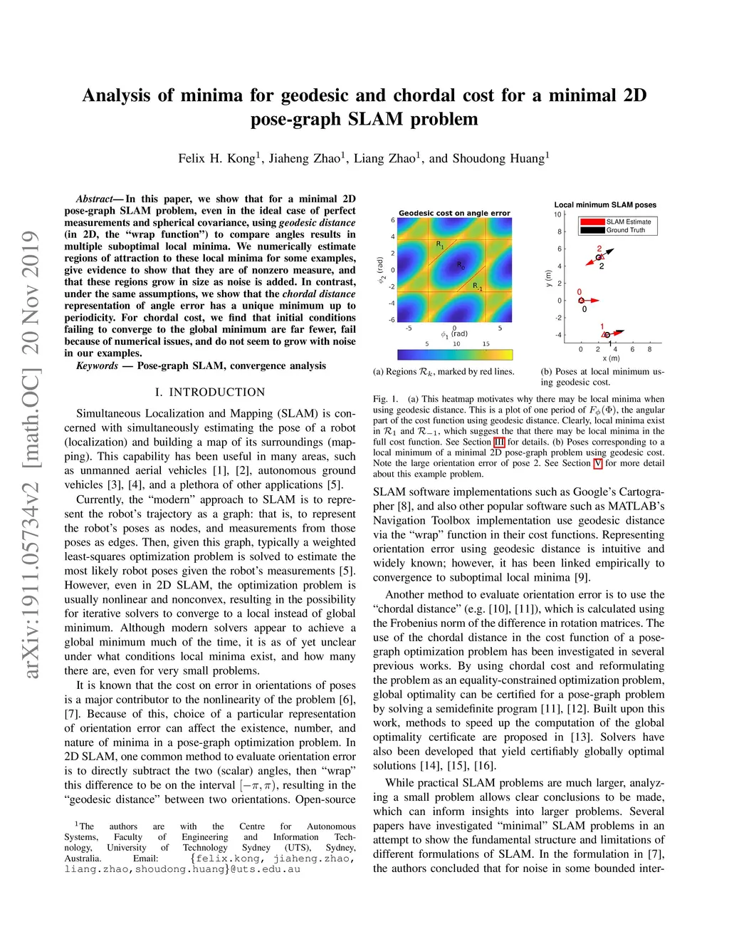 In this paper, we show that for a minimal pose-graph problem, even in the ideal case of perfect measurements and spherical covariance, using the so-called "wrap function" when comparing angles results in multiple suboptimal local minima. We numerically estimate regions of attraction to these local minima for some numerical examples, and give evidence to show that they are of nonzero measure. In contrast, under the same assumptions, we show that the \textit{chordal distance} representation of angle error has a unique minimum up to periodicity. For chordal cost, we also search for initial conditions that fail to converge to the global minimum, and find that this occurs with far fewer points than with geodesic cost.