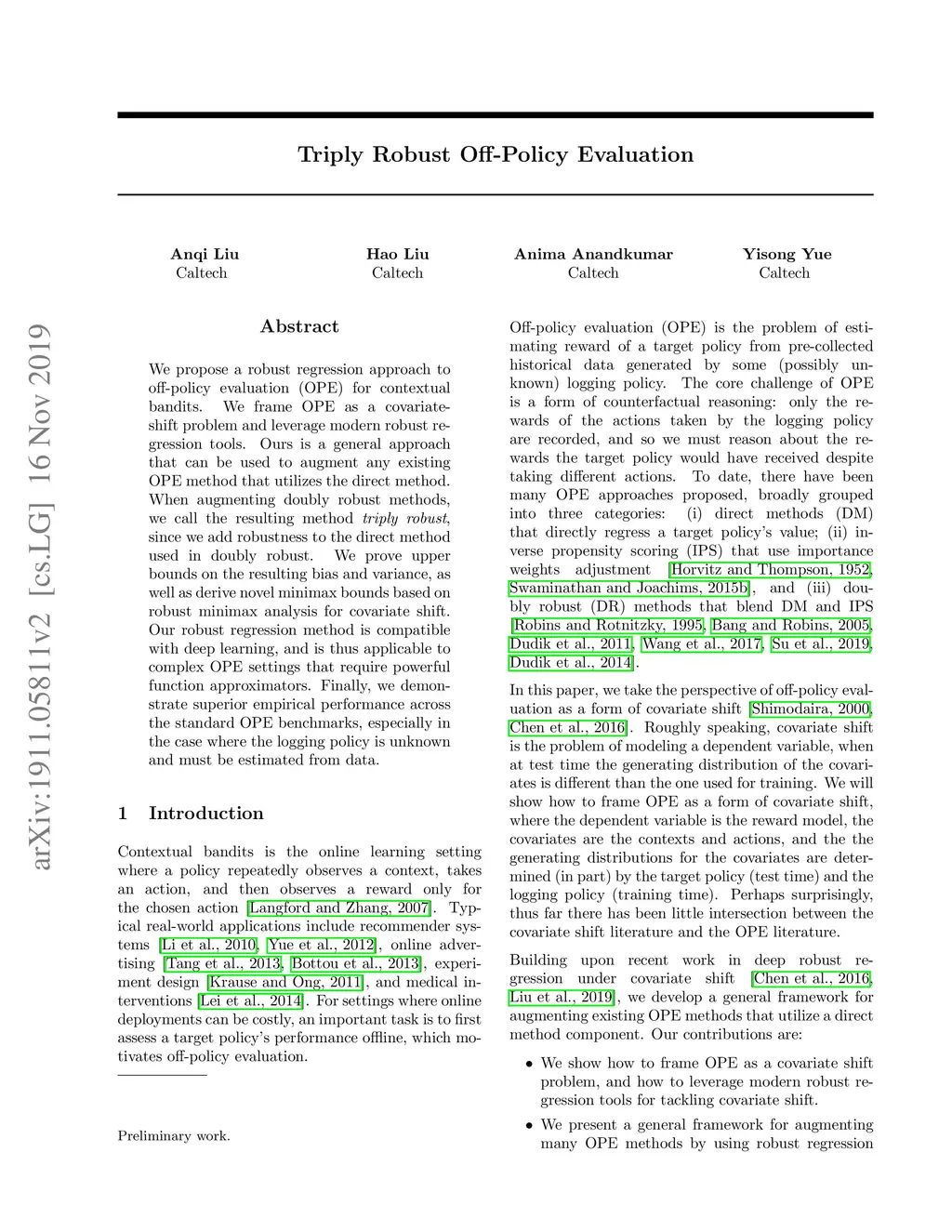 We propose a robust regression approach to off-policy evaluation (OPE) for contextual bandits. We frame OPE as a covariate-shift problem and leverage modern robust regression tools. Ours is a general approach that can be used to augment any existing OPE method that utilizes the direct method. When augmenting doubly robust methods, we call the resulting method Triply Robust. We prove upper bounds on the resulting bias and variance, as well as derive novel minimax bounds based on robust minimax analysis for covariate shift. Our robust regression method is compatible with deep learning, and is thus applicable to complex OPE settings that require powerful function approximators. Finally, we demonstrate superior empirical performance across the standard OPE benchmarks, especially in the case where the logging policy is unknown and must be estimated from data.