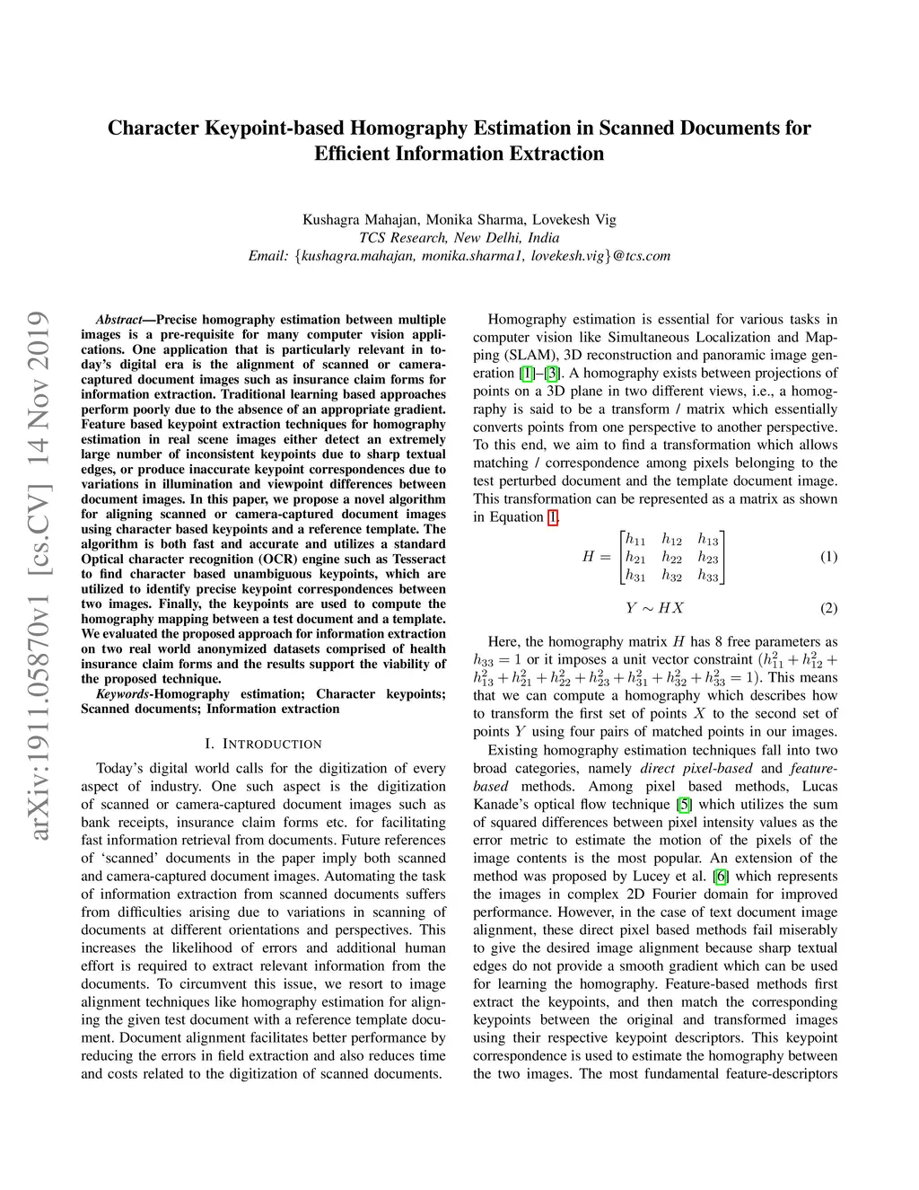 Character Keypoint-based Homography Estimation in Scanned Documents for